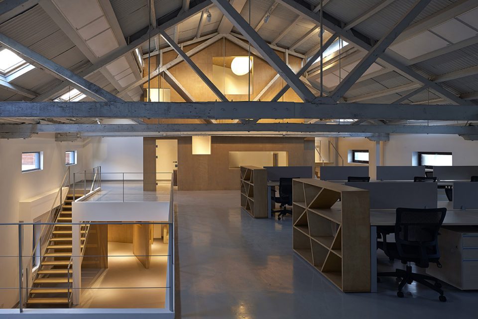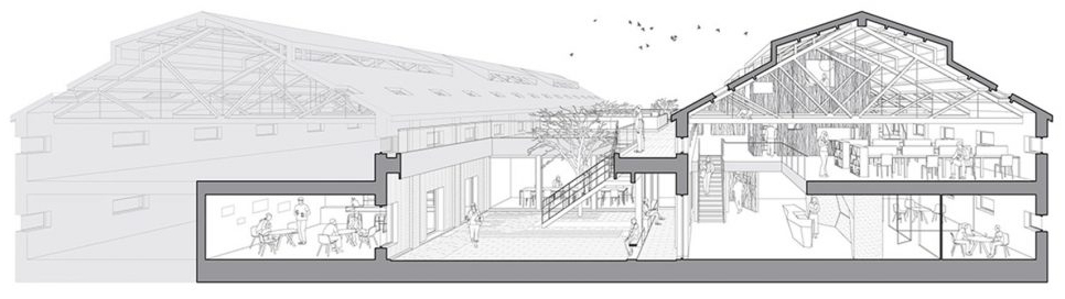 进入厂房内部,为充分利用高度而设置了夹层。并且,为了使整个空间能够激发使用者之间动态的交流,除了连接首层和夹层空间的数个吹拔之外,在空间内,尤其是夹层上植入了多个具有不同内容的木头阁楼(或盒子)。