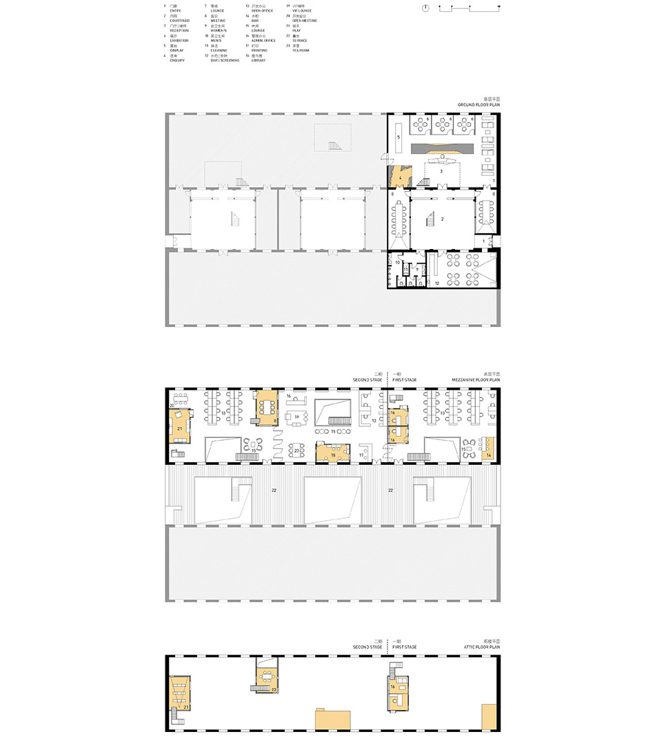 The Arrow Factory Hutong Media & Culture Creative Space is symbolically right next to the wall of the Imperial Academy heritage. The site is one the so called“arrow factory”- old warehouses with immense space inside, and the ground floor has already been devided and enclosed as a“Siheyuan” type courtyard, due to the previous hutong re-development. This project is a regeneration-by-intervention, starting from the existing spatial framework, yet aiming at transforming it from a vast empty warehouse to a space that filled with unleashed vitality, for crowds of people from creative cultural industry to gather around and communicate. It will not only offer diverse programs such as: meeting, screening, library, bar, entertainment, co-working…but also become a“collaborative commune”of those who are interested in the innovation of media and culture.
