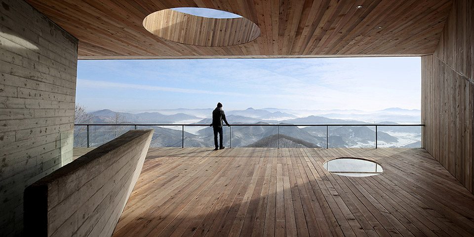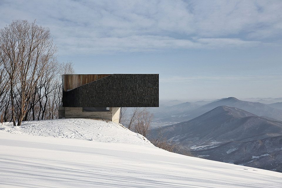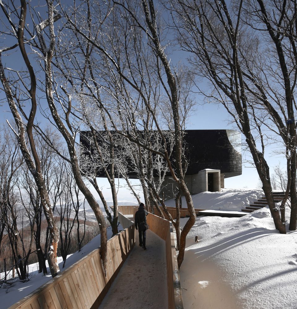 As one descends from the mountain top, the “Stage” rises slowly above the undulating landscape, in a way like a piece of leaf floating on the water. Positioned with the 2 side-line along the approaching eyesight of the visitors from two routes: the trail in the woods and the ski-slope. Not only it doesn’t obstruct the view to the lake and mountains, it even enhances the experience by inducing ever-changing tension between the cantilever and the surrounding landscape. The entire “stage” is like growing out from the mongolian oak forest, and cantilevering on top of the ski-slope. Because the orientation of the distant view (horizontal unfolding lake), and the close view (vertical extending slope) is at a different angle, the building results in a twisted gesture between the wood “stage” and the concrete “base”.
