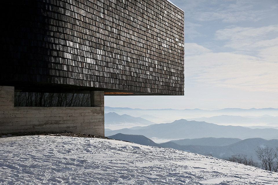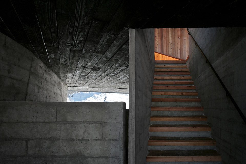 The building combined rough materiality with its sensuous form. Seen from afar, the “stage” is a dark, free-floating monolith in the landscape, with a heavy concrete “base”. Come closer, the reflection on the charred cedar shingles (Shou-Sugi-Ban) becomes faintly perceptible – even turns silvery with the changing angle of sunlight. After one meandering through the forest boardwalk and finally arriving in front of it, the chapped surface of the shingles and the wood texture of the cast concrete become tangible.