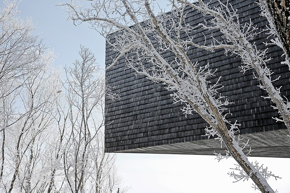 A pair of ovals openings cut through the volume, one on the roof leading sunlight and snowflake into the space, the other one on the floor intriguing interaction between people above and under the “stage”. The red cedar wall has been left untreated and is vivid in color shades, in contrast to the building’s dark charred-wood-shingle (Shou-Sugi-Ban) exterior.
