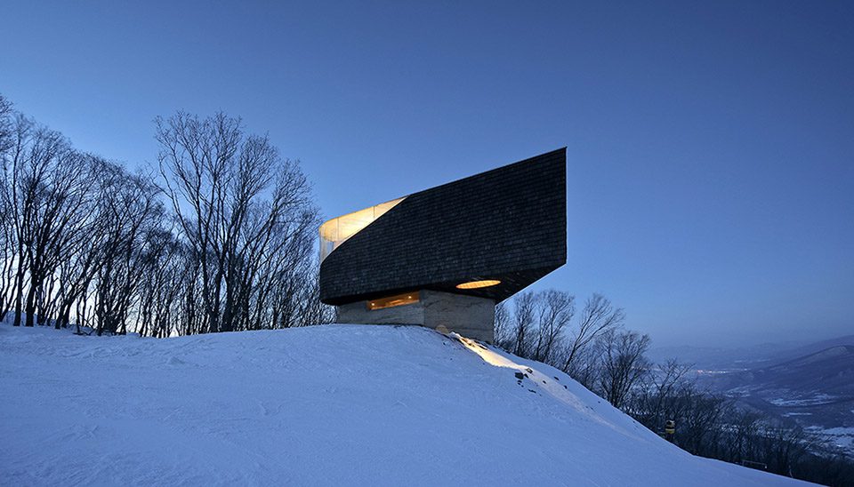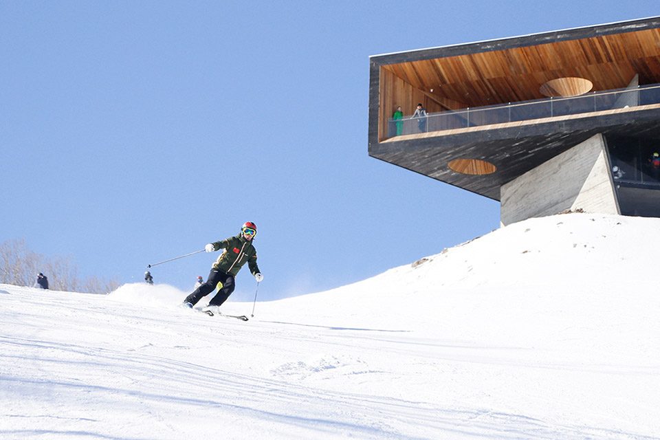 ▼森之舞台从起伏的地景中缓缓升起,悬挑于雪道之上,as one descends from the mountain top, the “Stage” rises slowly above the undulating landscape