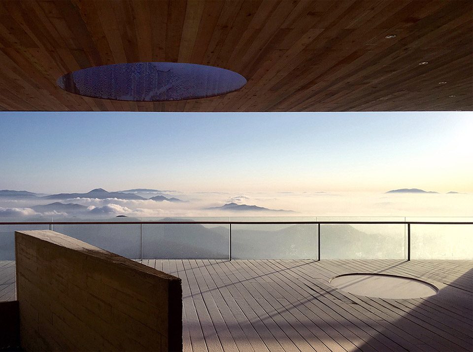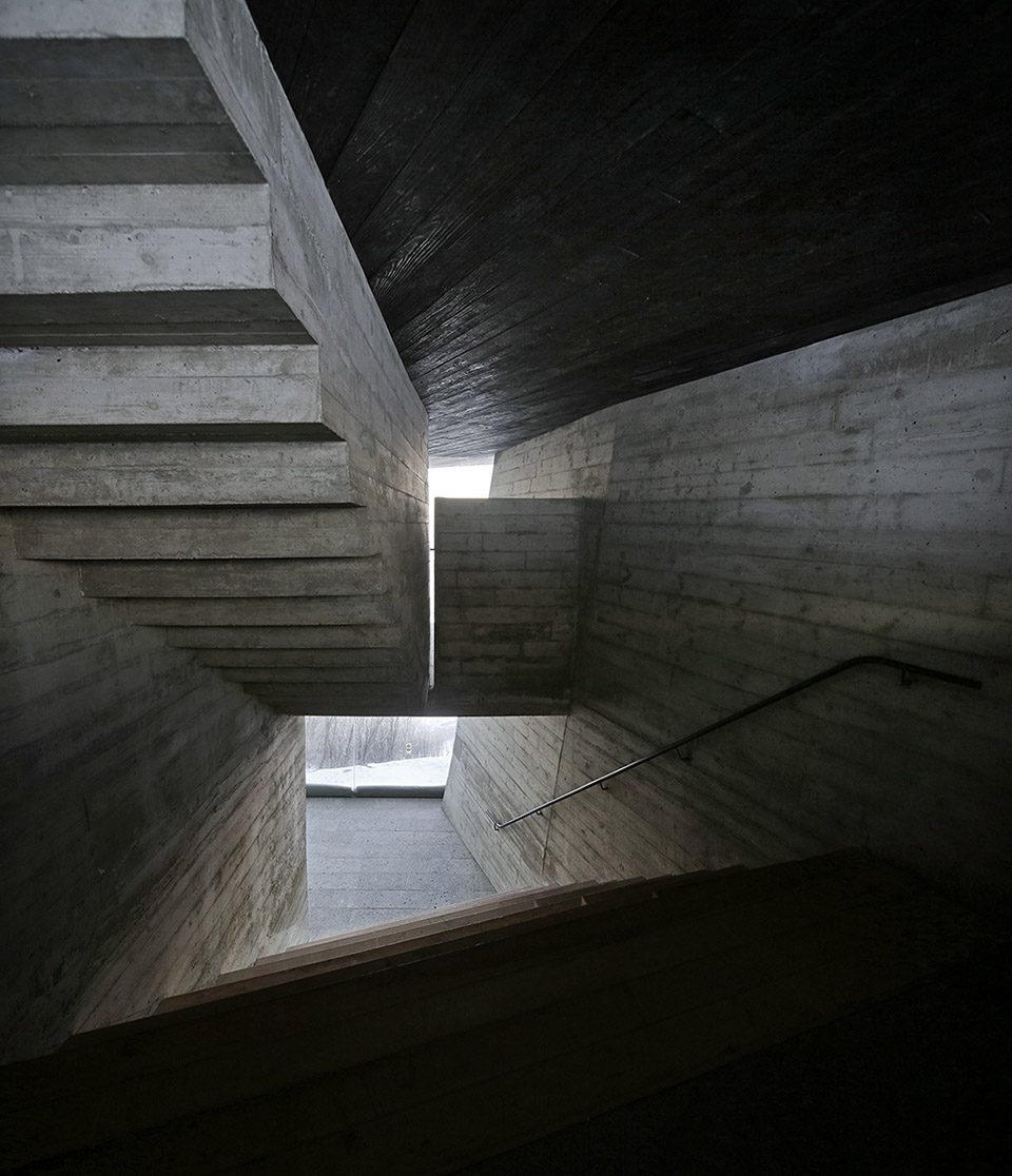 The interior is choreographed through a carefully plotted experience. Upon entering the concrete vestibule, in the moment your eye adjusts to the dimmed light, a vertical view along the stretching slope will catch you first, then a narrow staircase hints the only way of elevating. When you arrive at the platform level and turn around, what suddenly opens up to you is a great panoramic view of the Songhua lake, winding in-between the hills, clear or hazed by with the ever-changing mist, an exceptional vista that is breathtakingly beautiful and magical.