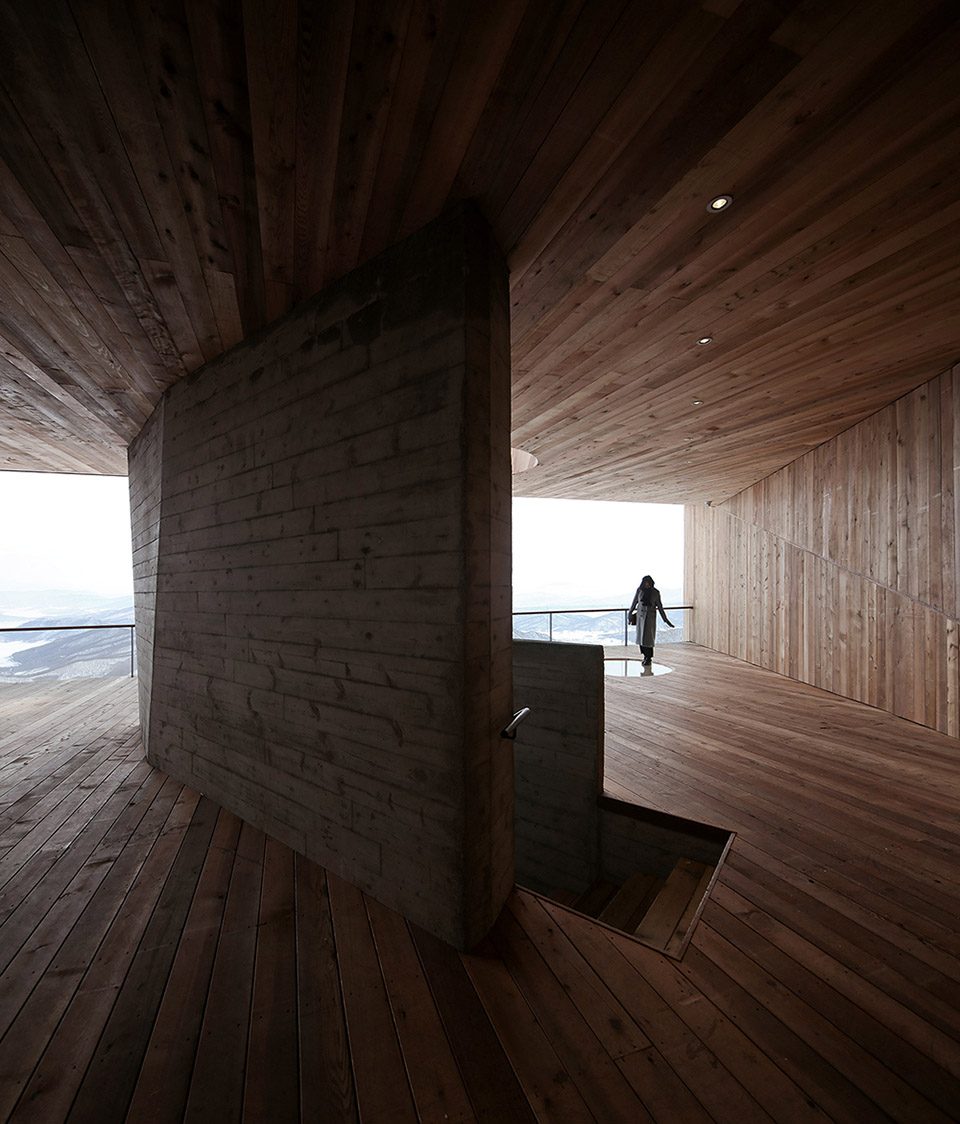 建筑的内部组织更是一场精心策划的空间体验。进入延长的混凝土门斗后,你的眼睛会逐渐适应昏暗的光线,同时被雪道向远处延伸的景观所吸引。随后,狭窄的木楼梯指引着一路往上的唯一路径。到达观景层后一转身,霎那间,松花湖的湖景和蜿蜒山林横陈眼前,呈现出大自然令人窒息的美。气候无常,湖面时而清晰可见,时而雾气蒸腾;冬天的山林,偶尔还会出现“雾凇”奇观。