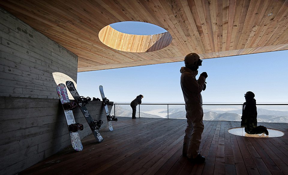 建筑师在平台的三角形体量中,斜切出一对椭圆形的洞口。一个洞口在屋面,等待雪花和阳光洒入室内空间。另一个洞口位于地板,诱发舞台上下的人互动。平台内部整体为未做处理的红雪松木板,保留着原木色差,与外侧深色的烧杉板表皮形成色彩与质感上的强烈对比。