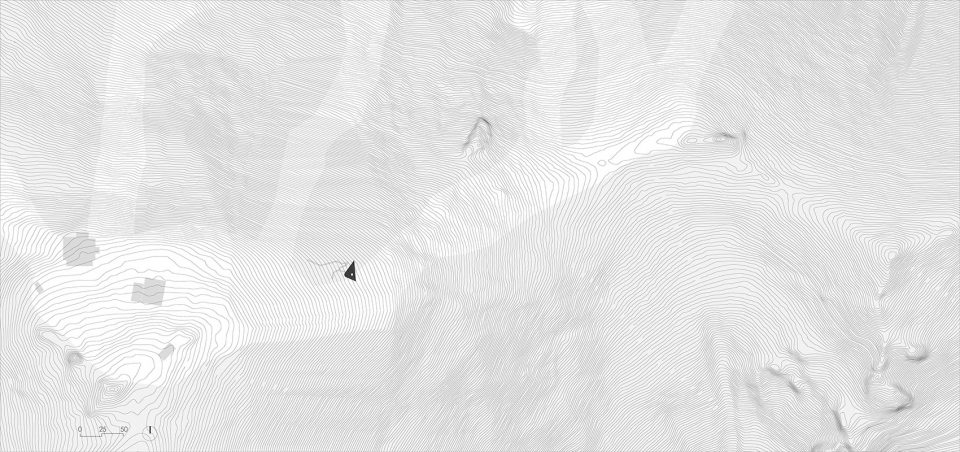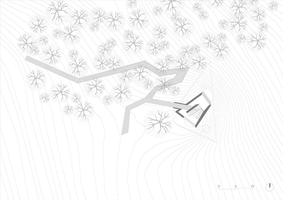 夏季,这里被浓郁的绿荫环绕;到冬季,粉雪覆盖一切,形成了一条绝佳的野雪道。这一“地景标志建筑”的选址,基于对场地条件的全方位考量。建筑师希望尽量减少建筑对现有植被的影响,同时保证观景平台上视野的最佳角度,由此确定了基地位置和三角形舞台的基本形状。