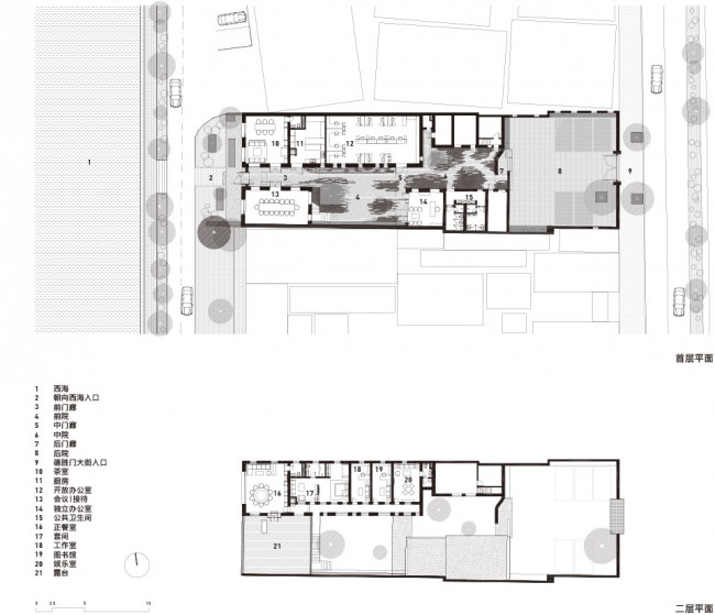 西海边的院子项目位于什刹海西海东沿与德胜门内大街之间的一个狭长基地,在德胜门城楼正南方不到四百米。面朝西海一侧的两排砖混结构的厂房建筑,前身就是什刹海地区久负盛名的蓝莲花酒吧,基地东侧则是七八十年代搭建的几间矮小破旧的临时性房屋,没有保护价值。房主希望能将这一贯通西海与德胜门内大街的地块改造成具有北京胡同文化特质的空间,同时又能满足一系列非常当代的混合使用功能 – 包括茶室、正餐、聚会、办公、会议、以及居住、娱乐。