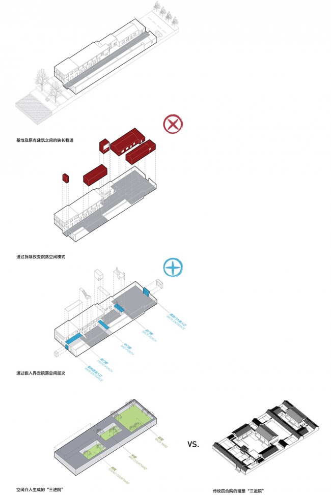META-工作室在对基地现有构筑物进行详细梳理后,进行了审慎的改造与介入。院子在空间改造上采取了“三进院”的形式,这里所提出的“三进院”,并非是对传统四合院中轴对称院落格局的模仿,而是力图通过错落有致,移步换景的空间层次,以当代的语言重新阐释多重院落这一概念在进深变化上的可能,同时构建房主期待中胡同文化生活的内涵,使整个基地内的日常行走成为一种连续的而又充满节奏变化的空间体验。