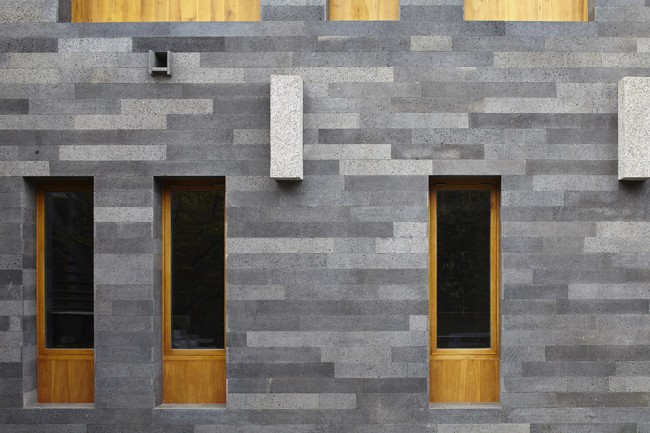 内立面和西立面上使用打磨成五种深浅程度的火山岩,在尺度和色差上都与胡同中府第深宅的外围高墙相近,而在纹理上却体现了更为精确细致的变化。通过复杂构造实现的大小比例各异的楸木室外门窗则为院子内部各个观察视点带来了变化丰富的表情,并最大程度上实现了由内向外的观景。
