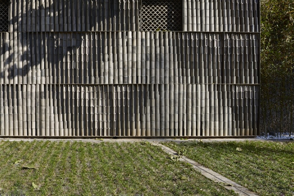 较为开敞的后院围墙则演化成为一场材料搭接的实验,在尝试了几种不同材料之后,我们确定了以“筒瓦”作为后院墙材料搭接实验的主体 -将本用于屋顶排水的筒瓦在旧墙内侧垂直叠放成为围屏,并通过精心控制的细微扭转,使这一原本灰暗的材料在不同光线与角度下呈现出耐人寻味的光影变化。