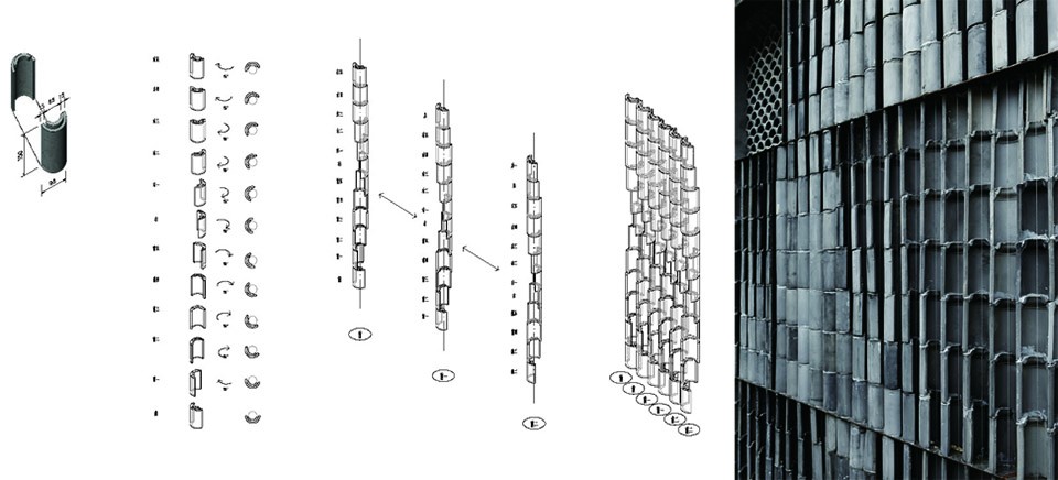 The fencing walls of the more open backyard have evolved into an experiment for material overlapping, after trying several different materials, we determined to use the “tube tile” as the main material for the walls of the back yard – thus the commonly roofing-used tube tiles for draining now layered vertically inside the old wall serving as a veil of fence, with carefully manipulated subtle twist, giving the original grey material a rich taste of light and shadow interaction under different lights and angles.