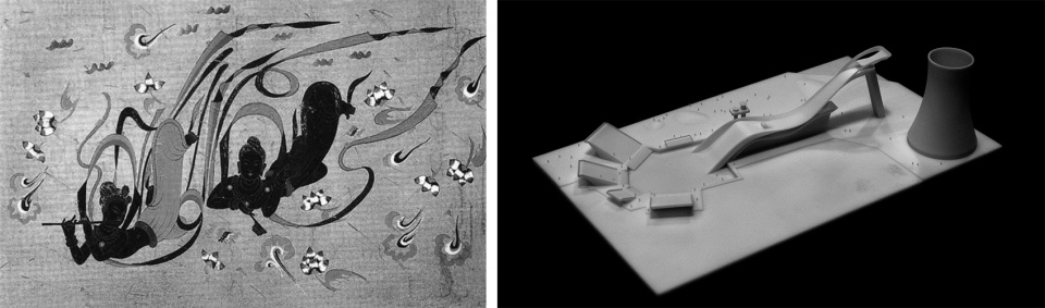▼“飞天”壁画(左)和项目模型(右),the the “flying apsaras” (left) and project model (right)