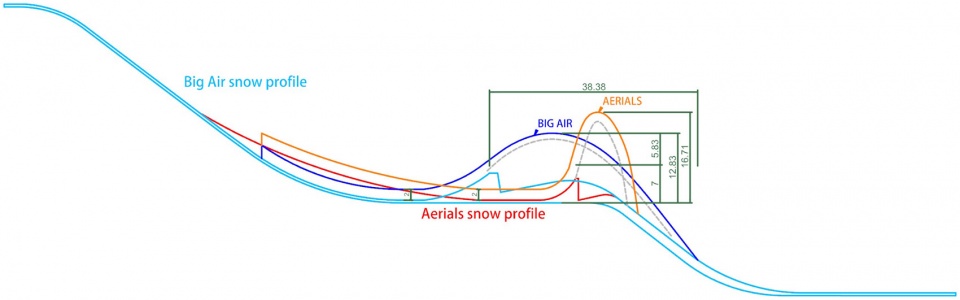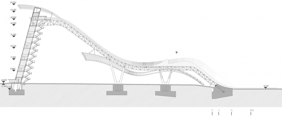 跳台主体结构为钢结构,总高度60.5米,长约164米,主体结构用钢量4100吨,其中大量采用了高强钢和耐候钢,节省用钢量达到9.75%,减少碳排量约950吨。跳台结构的剖面曲线在满足Big Air竞赛要求同时,为空中技巧比赛预留了剖面变化的可能性。在造型上三条飘带简洁表达出“飞天”飘带的概念,顶部飘带标识出发区,中部飘带为主体包裹兼有抗风柱、竞赛照明灯杆和安全防护网支撑结构柱,并兼有防风作用,下部飘带与中部飘带和主体结构相互掩映,同时为将来跳台底部的空间改造提供可能。