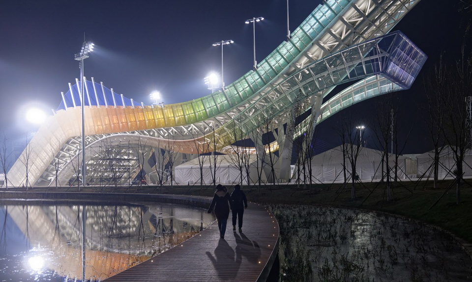 Shougang Big Air is the world’s first permanent venue for Big Air. It is also the first venue in Winter Olympic history that is directly combined with industrial heritage reuse. The sculpt design was inspired by the matching of the venue’s profile curve with the image of the “flying apsaras” ribbon from Dunhuang. The steel structure design of the venue also reserves the possibility of changing racing profile for future competition.