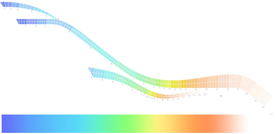 在色彩尝试方便就更为艰难,因为对于颜色大众会有自己的理解和感悟,如何在工业遗址中找到符合首钢气质又有奥运标致的色彩存在成了困扰团队很久的问题,经历了无色、单色、多色、暖色、冷色、拼色、双面色、渐变色等多种方向的尝试,最终选用了以冬奥会徽色彩为基调的渐变方式,整体颜色偏冷,从顶部开始的蓝紫色、绿色蔓延了整个助滑区,适于冬季冰雪运动特色,起跳区黄色和红色的渐变节奏加快,使较暖的颜色在接近地面时结束,渐变色配合穿孔铝板和造型本身的扭转,将“飞天”飘带概念体现得淋漓尽致。大跳台在首钢园整体偏灰的工业背景下跳脱又并不突兀,在群明湖倒影的映衬下显得尤为灵动飘逸。