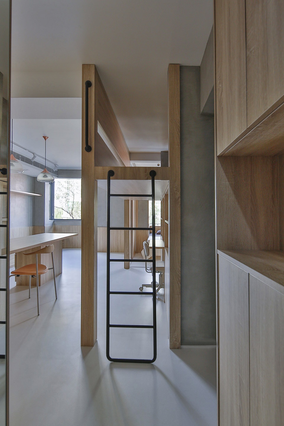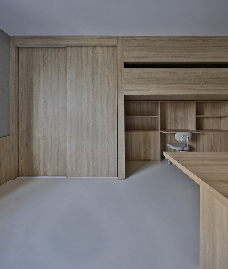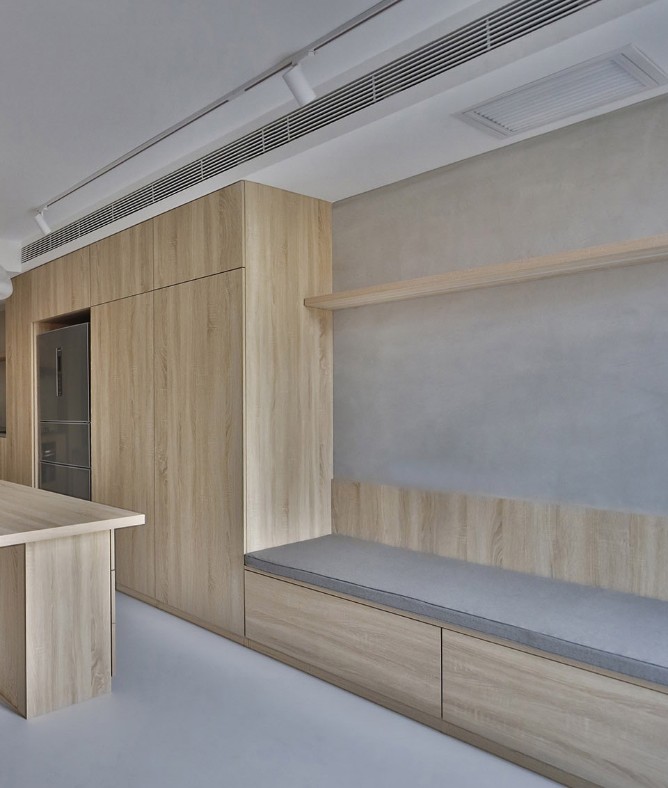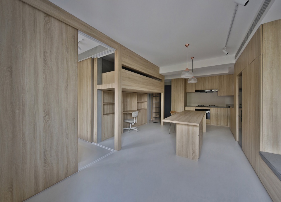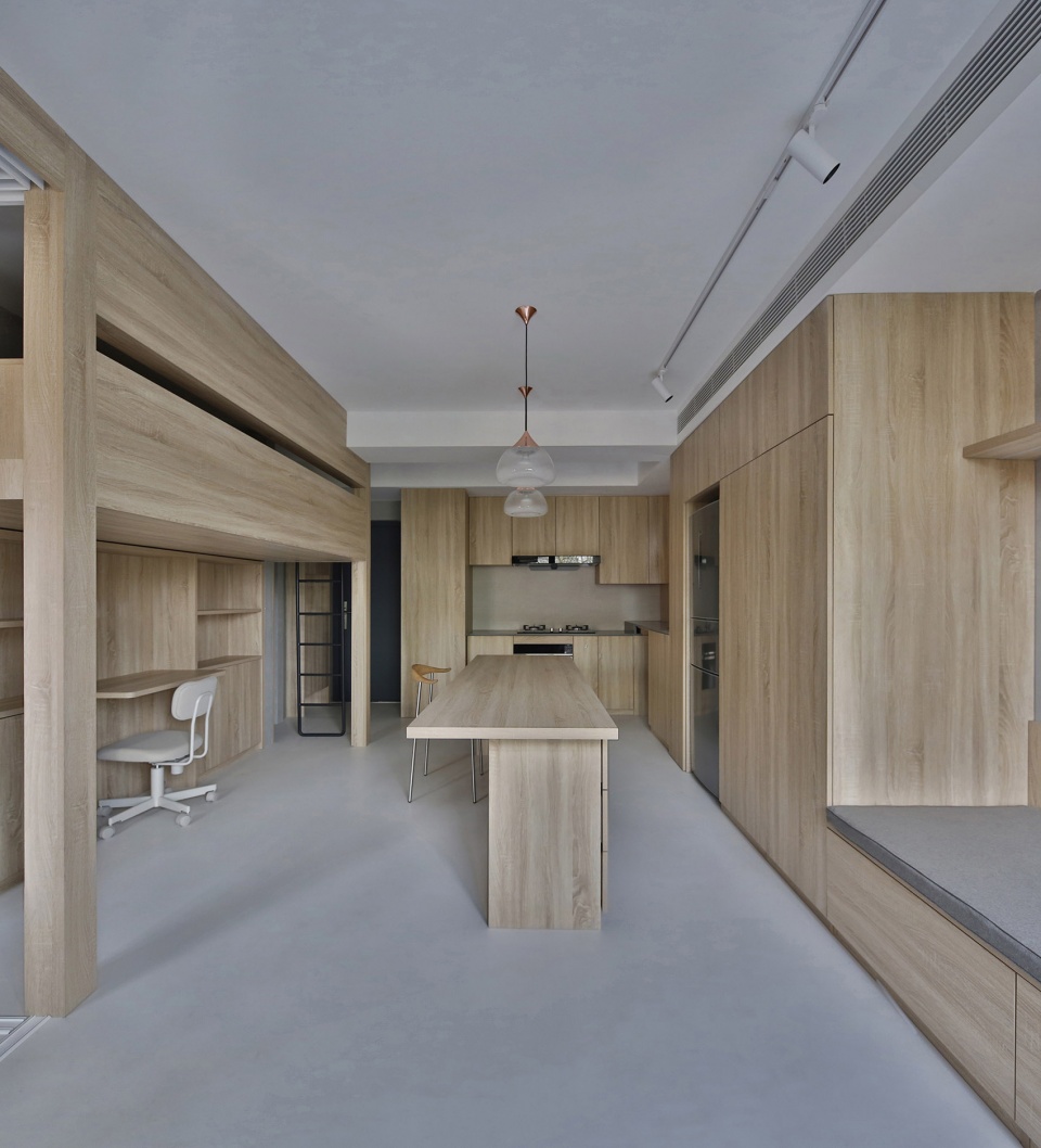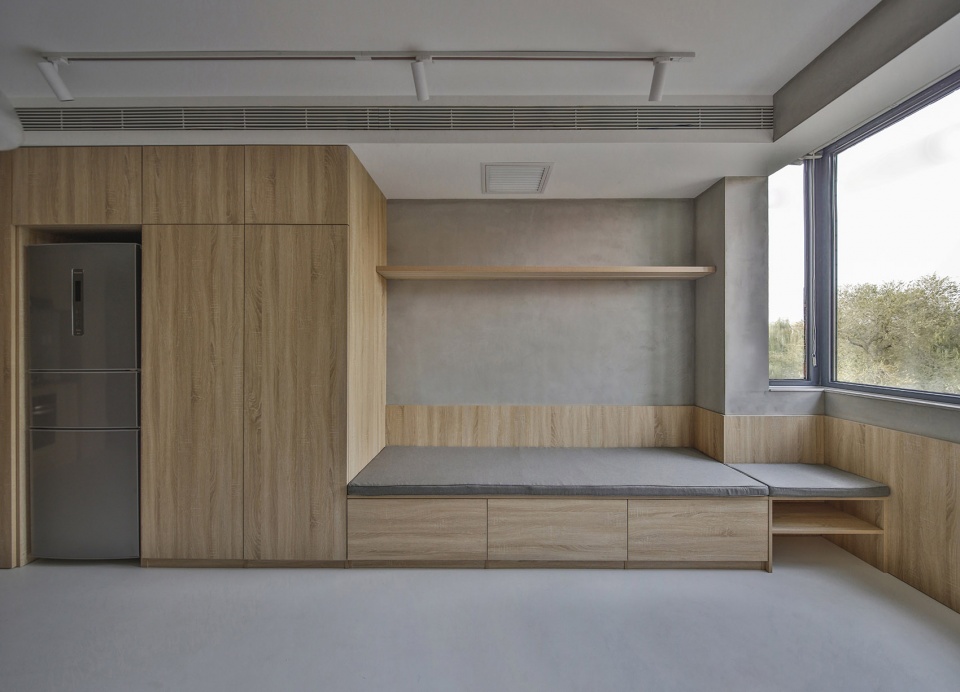 When the entrance door is opened, it is faced with the child’s bed and the study area, two windows can be seen at the same time, the view can reach the outdoor trees. Living space, dining room and the kitchen are inside one space, the electrical appliances and the study room are gathered and integrated in a big high cabinet. The child’s room and study space are on one side of the dining room, and the rest space on the upper part is made safe enclosure, leaving a gap to increase fun Booth sofa’s depth is 700mm, the male host can occasionally live here for a night. The open case under the booth is reserved for the sweeping robot, The walls are paneled with closet door panels, with cement paint on the top. Divide the bedroom and living space through sliding doors partition. The 2200mm long dining table is suitable for the whole family to have dinner every night, and it also serves as the operating table of the open kitchen. The small window in the kitchen provides a small amount of natural light for the dining room.