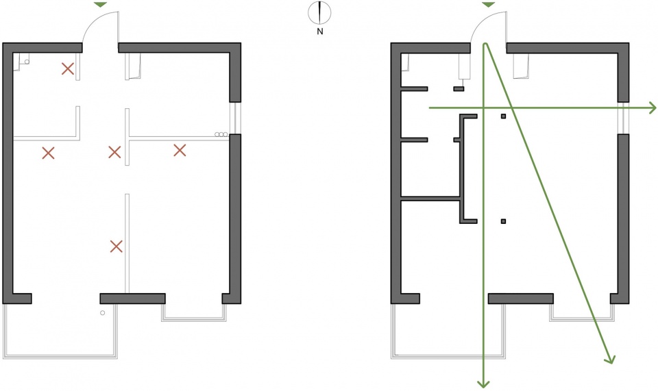原本的空间为常规的一室一厅一厨一卫一阳台,各空间都相对独立,卫生间面积偏小,厨房内有一个小窗,是在与邻居的共享天井处,有通风和视觉延展的功能,采光功能非常微弱。设计将内部的轻体墙移除,重新规划空间与墙体时,保留了入户时视觉的最长延展,在玄关换鞋的同时,可以看到空间内的3处是外采光窗,这样做的原因是,在小空间内,通过视觉延展的方法,来放大居住者对空间的感受。