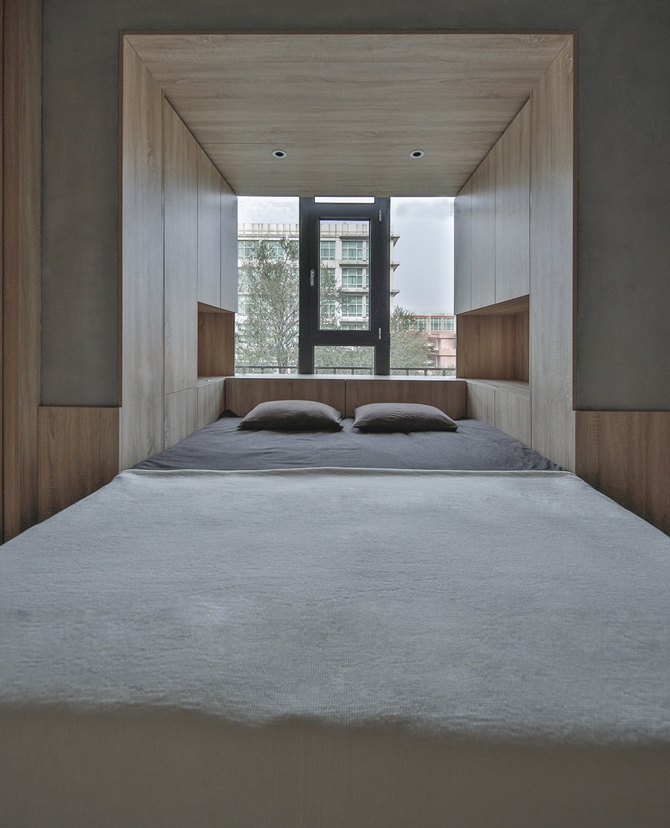 In the master’s room, I make the balcony top surface full of furred ceiling hidden beam to reduce the depressive feeling that beam brought to the bed, both sides and the head of a bed had storage function.
