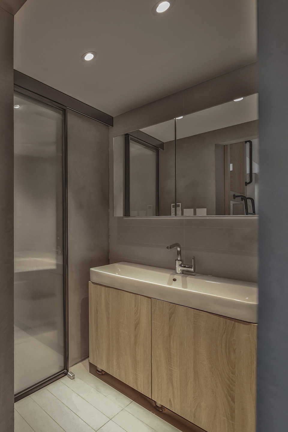 A big washbasin in the wash room is convenient for my grandparents to use and for hand washing of clothes. The design added a bathtub and a separate shower for various use demands. The back of the toilet integrates the water tank with storage in a large cabinet.
