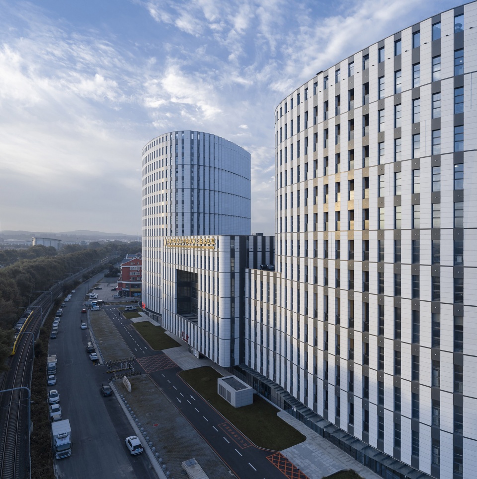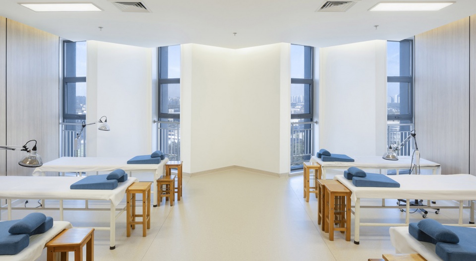 The building is given an outer skin that emphasizes the vertical alternation between ribbon windows and aluminum panel curtain walls, which draws inspiration from the vertical texture of ancient Chinese bamboo slips. The choice of building materials, members and colors, characterized by simplicity, aims to create a modern, restrained and diverse image, which works in concert with the immediate environment and exemplifies the cultural traits of a traditional Chinese medicine hospital.