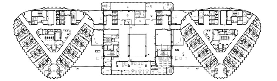 平面功能布局充分结合地形。三角形住院部平面,最大化有利朝向,让所有病房均享有南向采光和校园景观。朝向城市干道的一侧布置交通核和辅助用房,起到隔离城市轻轨噪音的作用。