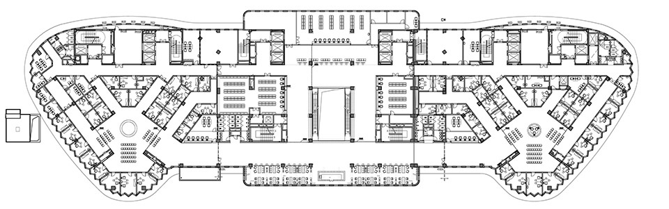 The layout of the building is developed based on the terrain features. A triangular floor plan of the inpatient department maximizes the benefits of building orientation by putting all the wards south-facing, giving them sufficient sunlight access and campus view. Circulation hub and auxiliary rooms are placed on the side facing the arterial road to reduce traffic noise from the light rail.