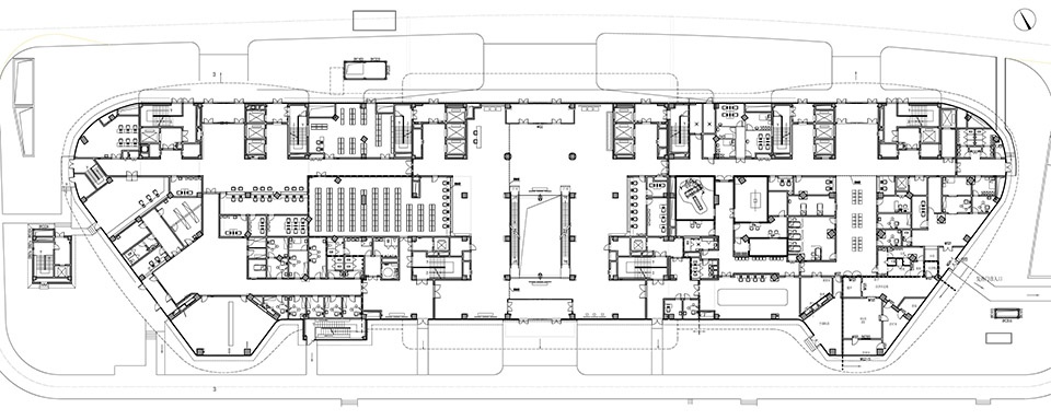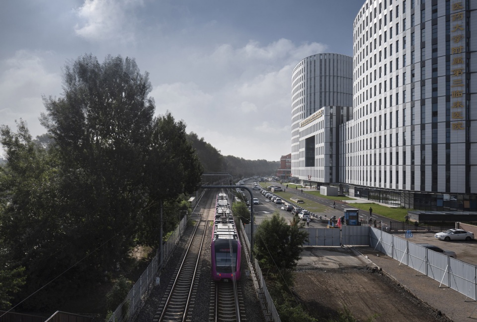 Located in the northeast corner of the university, the Third Affiliated Hospital of Changchun University of Chinese Medicine is a Grade III Class A hospital of traditional Chinese medicine. The building is structured by a 6-storey linear shaped podium with tower A and tower B on the east end and west end respectively, amounting to a gross floor area of 83561m² including 57,966m² aboveground and 25,595m² underground. The podium floors accommodate multiple functions such as the outpatient department, the emergency department, the inpatient department, the physical exam center, the clinical laboratory, etc. In total, the new hospital has a bed capacity of 700.