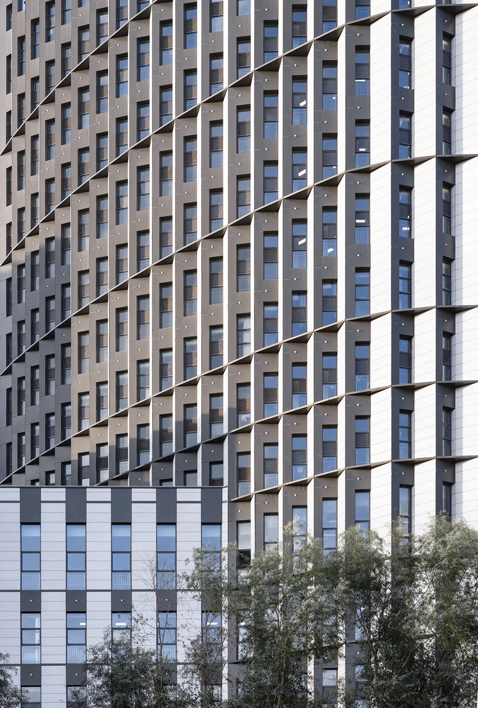 On the west façade, the window orientation has been carefully adjusted to avoid western exposure to the sun while bringing the best sceneries into view, which is beneficial for rehabilitation and convalescence. In this way, the two inpatient departments have a visual connection despite the physical distance in-between. The windows are angled to avoid direct views of one another to protect privacy in the ward. On the north-facing façade, the wall area between windows is parallel to the light rail to achieve the maximum effect in reducing noise.