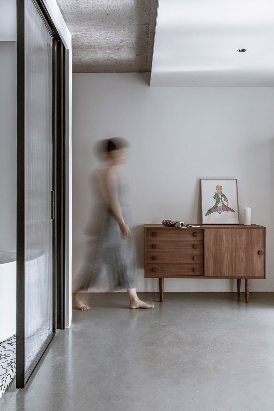 2: A white central axis ceiling goes through living room and bedroom. After the removing of the walls surface, concrete texture of the structure is saved, which makes a bright contrast with the white ceiling.