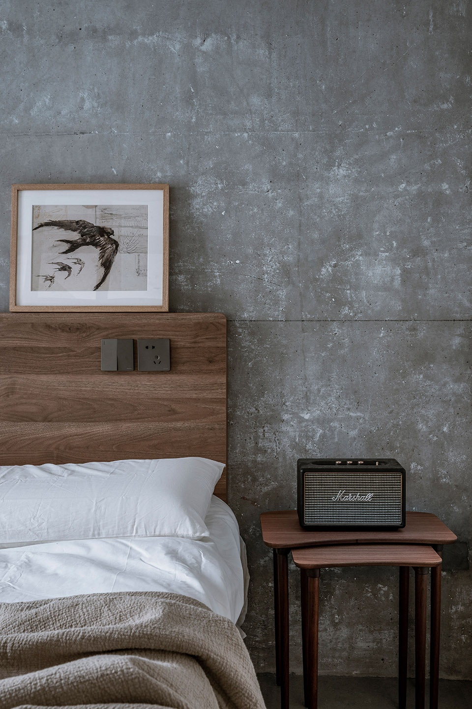 2:一个白色中轴线吊顶,贯穿了起居室与卧室。 墙皮铲除后保留了建筑结构的混凝土质感,与顶面的白色吊顶形成了鲜明的对比。