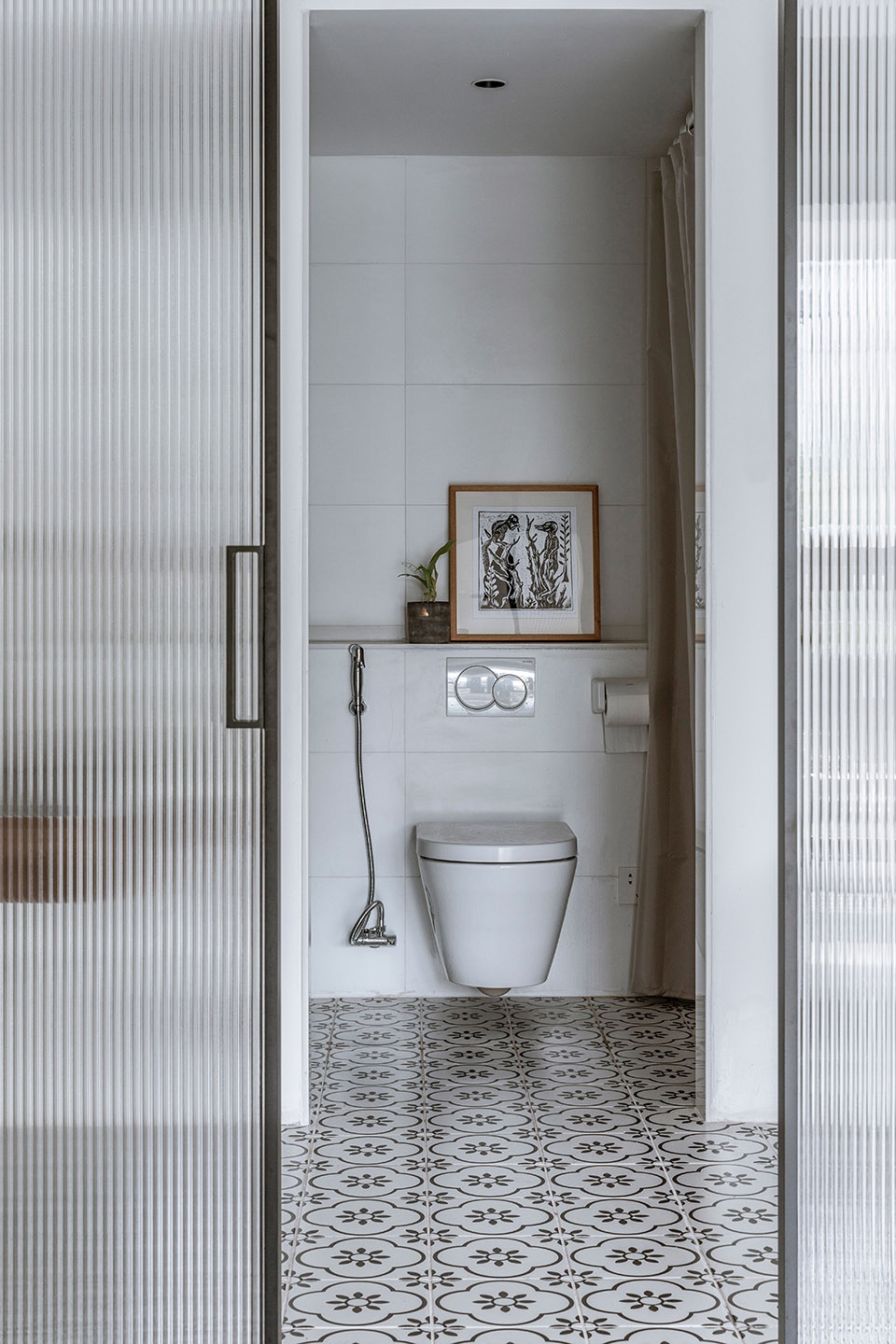This house was a general set of one bedroom with one living room. With 43 square meter, this house was divided into separated bedroom, living room, kitchen room, and bathroom by three partition walls. Problems in bathroom were especially serious with dark and narrow space. Damp situation of shower area extended to all floor of the bathroom.