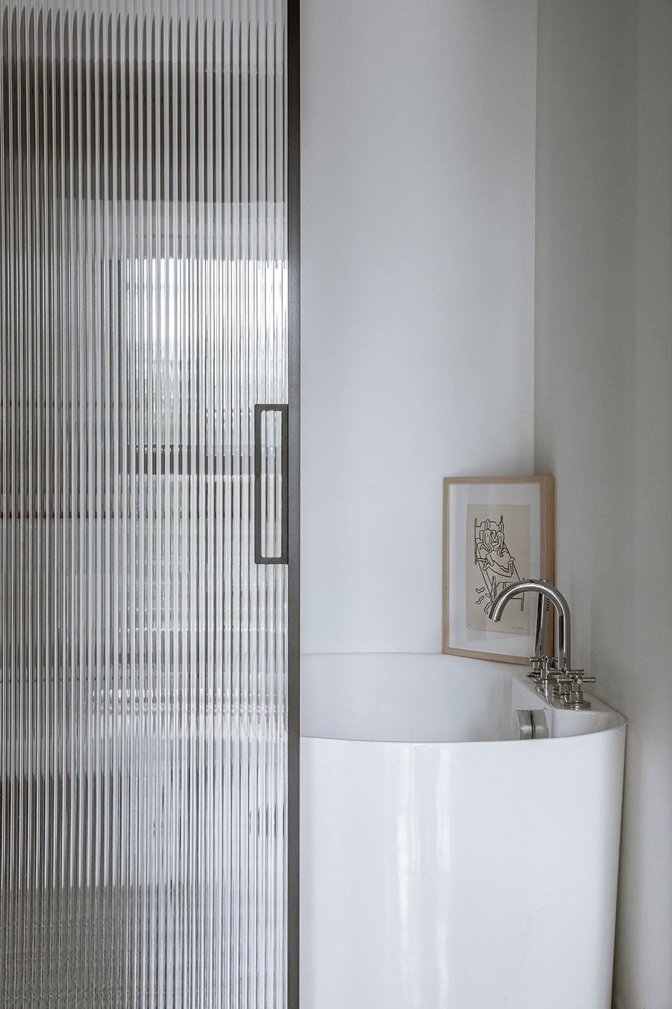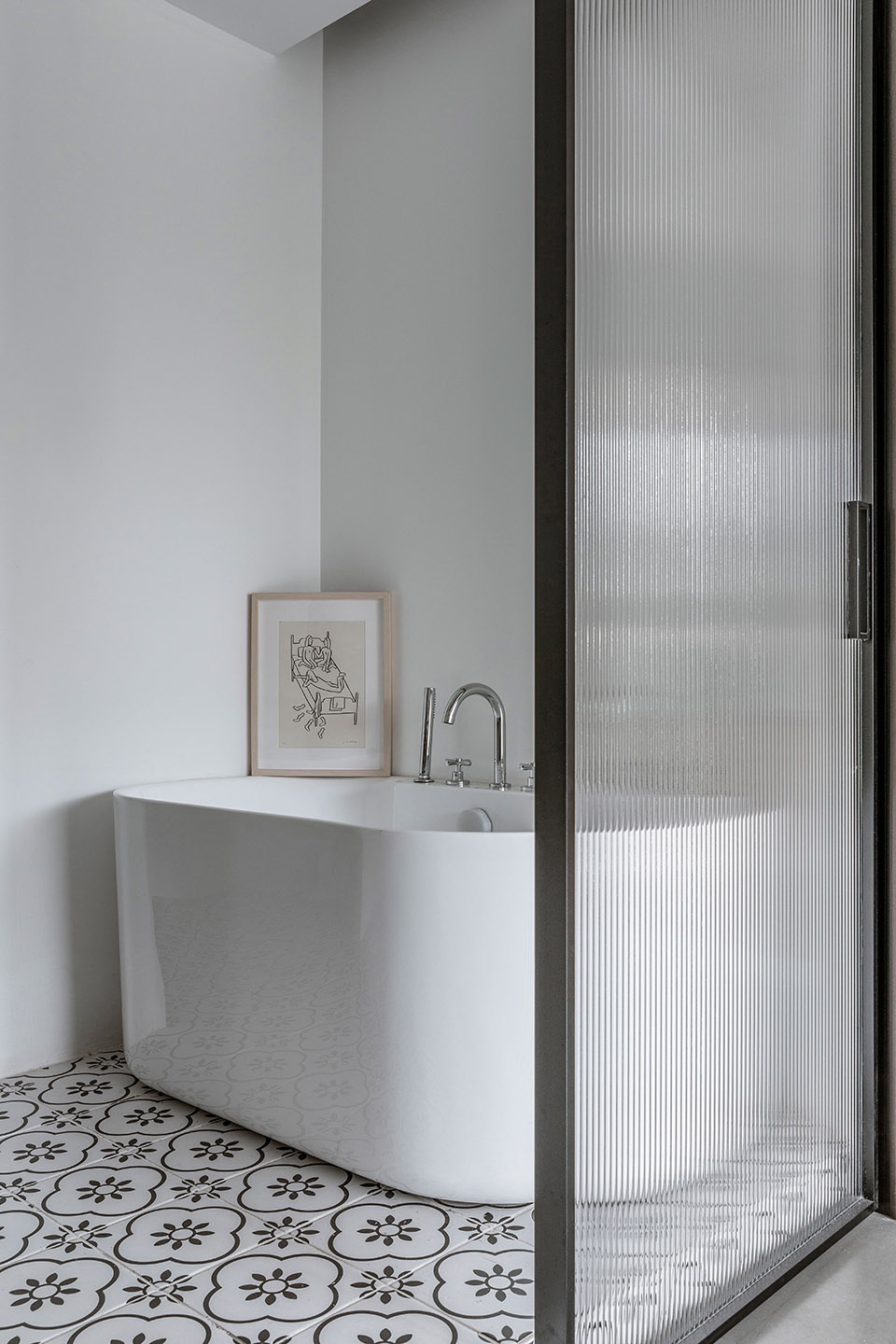 2: In order to control the usage of material, only one super white lacquered glass was set behind the wash basin to block water. All other walls in bathroom were only painted