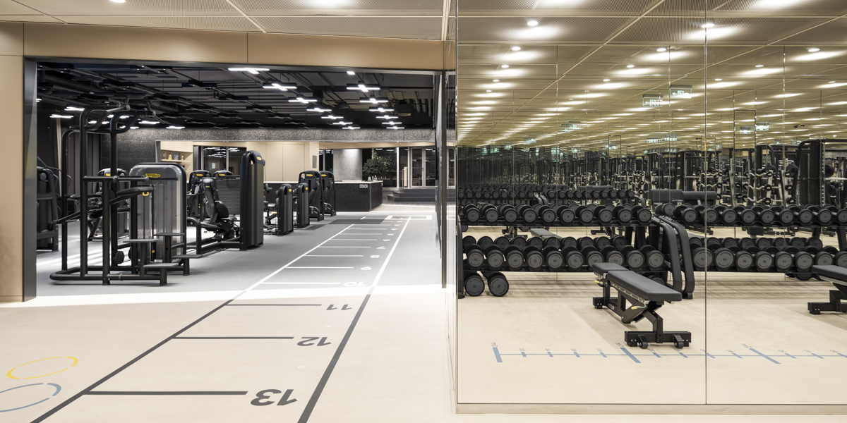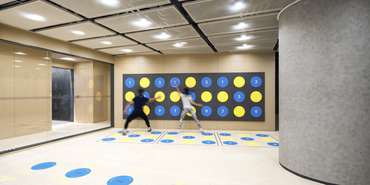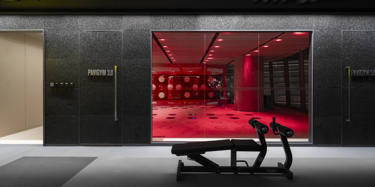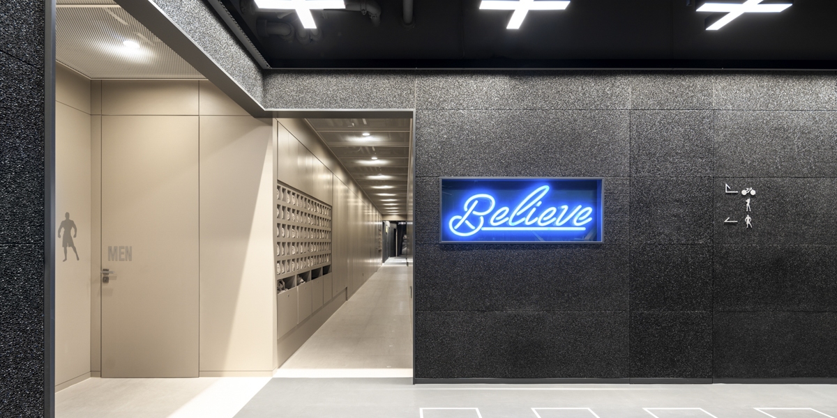 The gym was given a darker colouration for its open AKA "outside" areas. Here, wall cladding made of grey-tinted aluminum foam gave a sense of weightlessness similar to that of being on the moon. A grid of custom-designed spotlights were also constructed to resemble a panoply of stars shimmering across the universe and added to the moon-like atmosphere. The "inside" areas were, in contrast, tinted with warm, light vanilla tones and built with lower ceilings and stronger illumination.