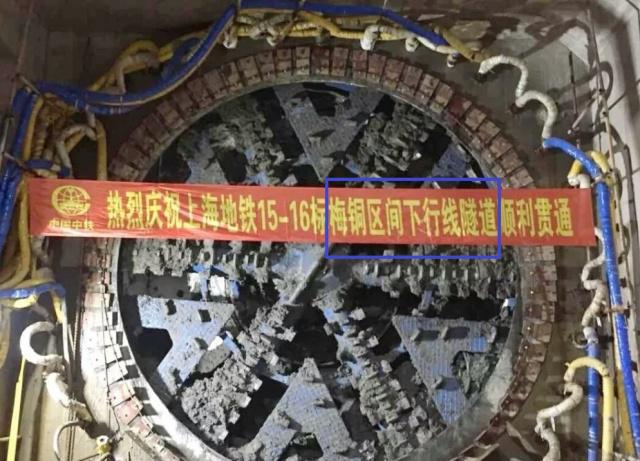 从施工的标志上可以看出,上海地铁15号线梅岭北路站-铜川路站的下行隧道已经顺利贯通,图中巨大的圆盘旧城地铁线路的通用盾构机。