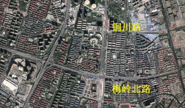 Shanghai Metro Line 15 is above Daduhe road. The traffic situation nearby is: Tongchuan Road station is located at the intersection of Daduhe road and Tongchuan road. Meiling North Road is located at the intersection of Daduhe road and Wuning Road. The following figure is the satellite image of Mei Tong section of Shanghai Metro Line 15.