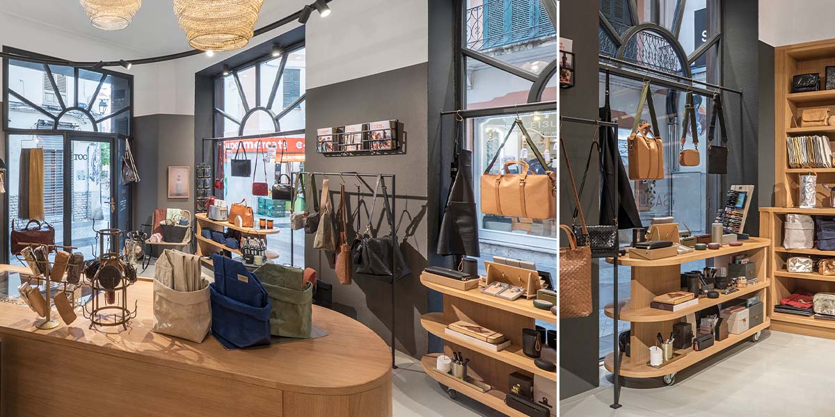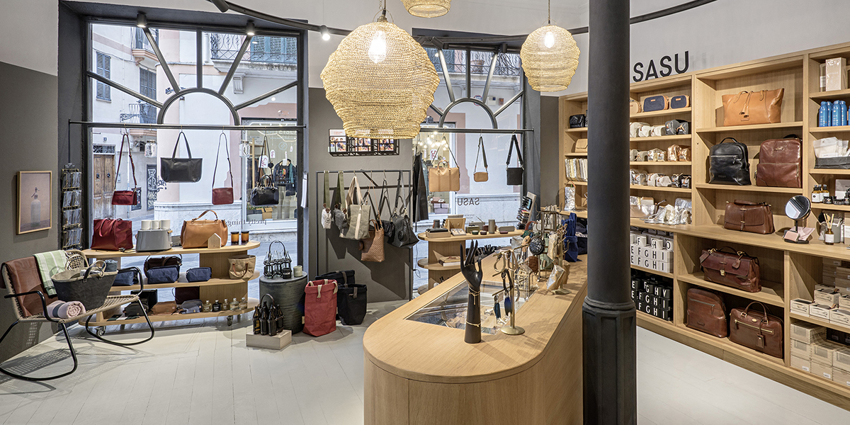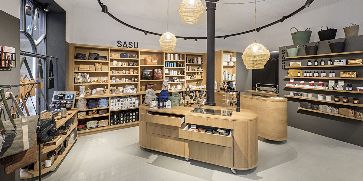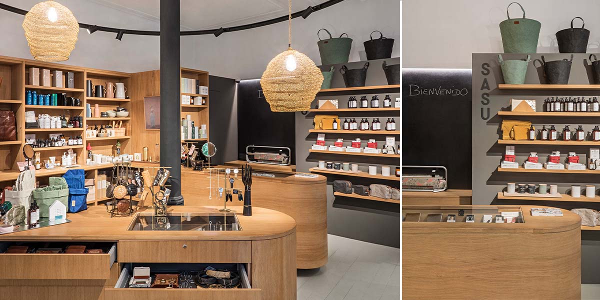 SASU Palma is a corner store on the ground floor of a 5 story, 100-year-old building along Plaça Major, a historic public square and craft market. Similar to the Vienna project, anySCALE needed to work around inherited structures, in this case, an original steel column near the middle of a trapezoid-shaped layout. Instead of seeing this as a limitation, the designers used it to define the center of the space with a circular spotlighting system and decorative pendant lights. To accommodate SASU’s diverse products, anySCALE played with the type and density of custom-built, wood displays. Boxy shelves of different heights are built into the thickest backwall, while slender floating shelves are used on the thinner partition wall that hides the basement staircase. Rolling, free-standing displays can be positioned in the windows and around the column in the center, allowing for customer flow and flexibility.