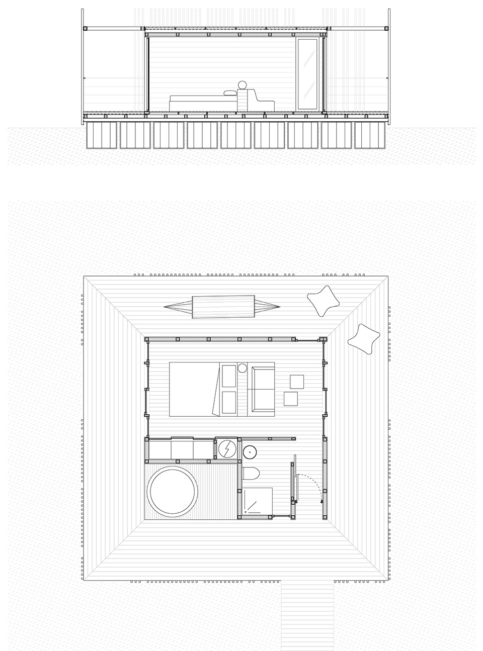 The changes of the seasons and the hours of the day constantly transform the presence and the dynamics of the hut with the landscape. With leaf trees, the architecture integrates with the landscape in a perfect game of camouflage. In winter instead, with the earth and the lake gathered under a blanket of snow, the vertical lines of the battens are reflected on the water. During the day, the experience inside the suite is a play of light and shadow with the sun filtering through the screening. After sunset the effect is reversed, immersed in darkness and illuminated only by the moon, the hut evokes a lantern, radiating the internal golden light between the wooden slats.