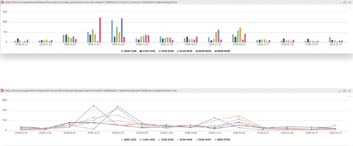 5. Customize the development platform according to the demand, count the overtime number of different types of work in different time periods through the statistical table of construction personnel every night, and finally collect and summarize it into the monthly overtime column and broken line statistical chart; Intuitively display the fluctuation of overtime. Update every day, and the histogram and line chart will be updated accordingly. It effectively reflects the changes of personnel in the construction process and provides strong support for the construction progress and personnel scheduling.