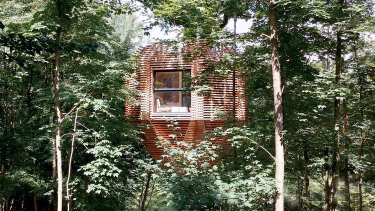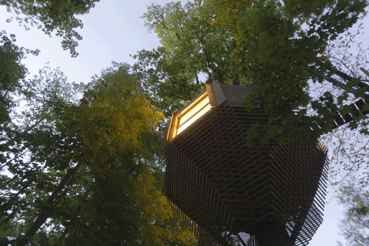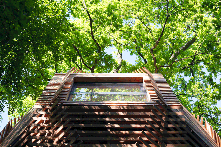 A belvedere on the oak forest of the domain, as surprising as unexpected because it’s hidden by the exterior wooden cladding.