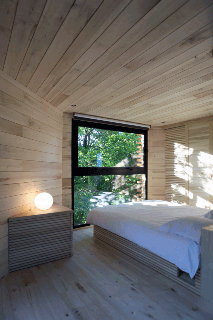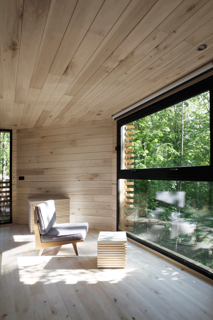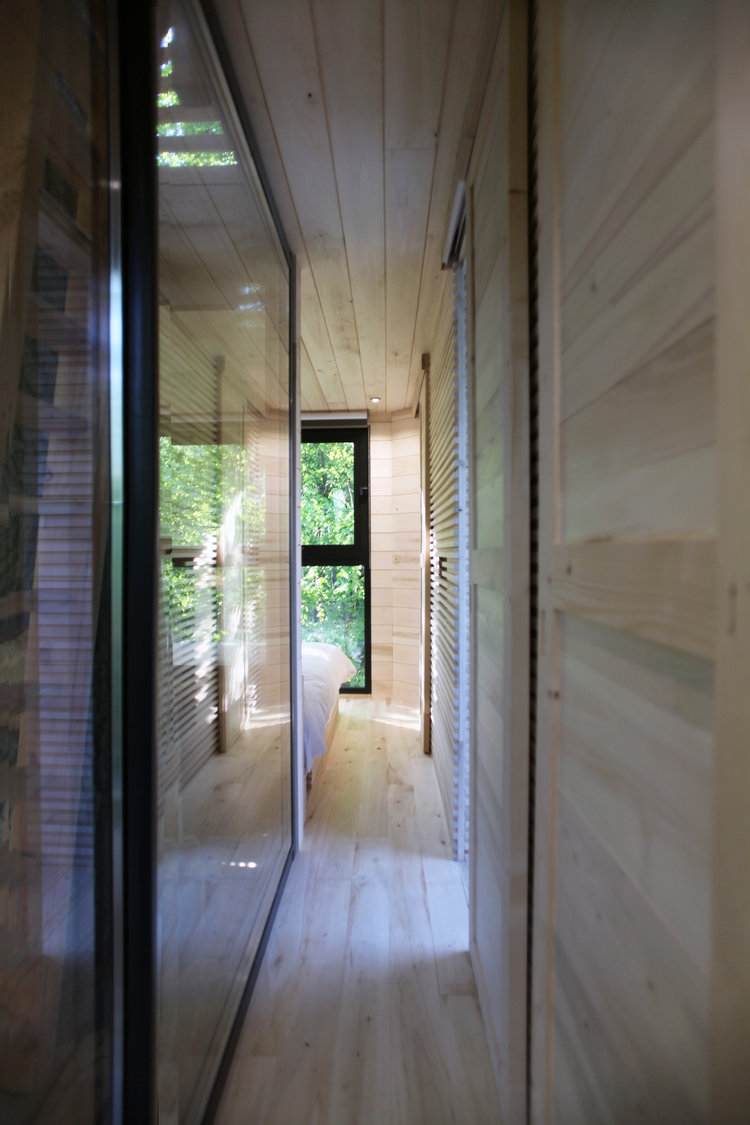 Once in the patio a feeling of protection reings as in a nest, with an easy access to the living area thanks to two large sliding glass doors. A cosy, bright and intimate atmosphere fills the space thanks to the large windows. The inner lining of the wall is made out of poplar, a light and clear wood essence with a subtile yet present scent.