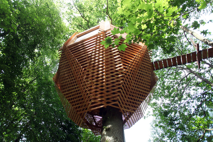 诗意与木工技艺的交汇点,ORIGIN 树屋在拉雷城堡森林的百岁橡树中脱颖而出,仿佛它一直是风景的一部分。