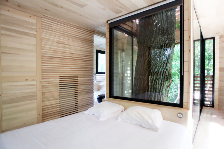 As its customers often wanted to define it, ORIGIN is an exceptional cabin, a unique and tailor-made project. A hundred-year-old oak, one of the most beautiful and tall of the domain of the Château de Raray was the starting point for the whole reflection: how to sublimate the tree? Creating around it a tailoring wooden-dress.