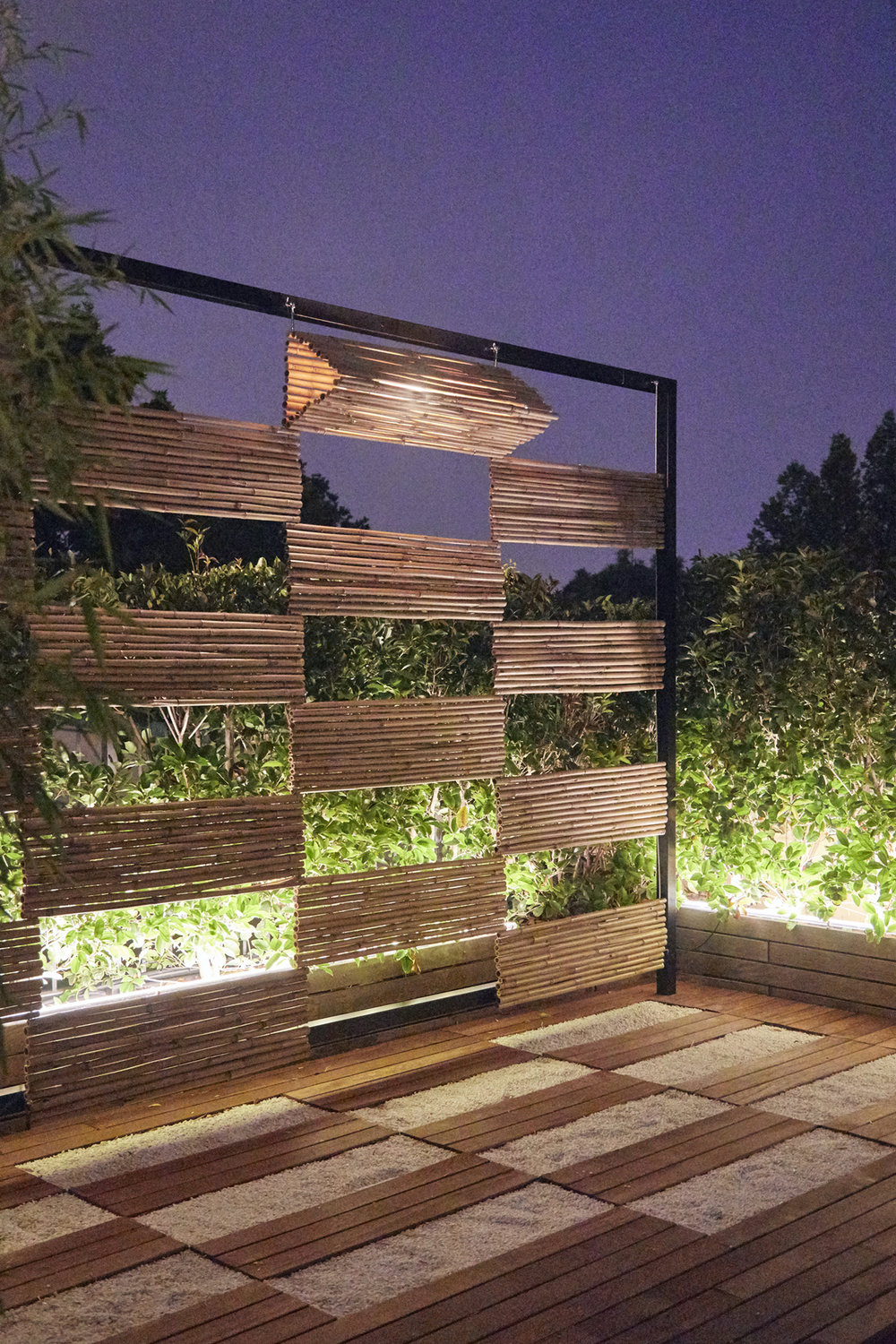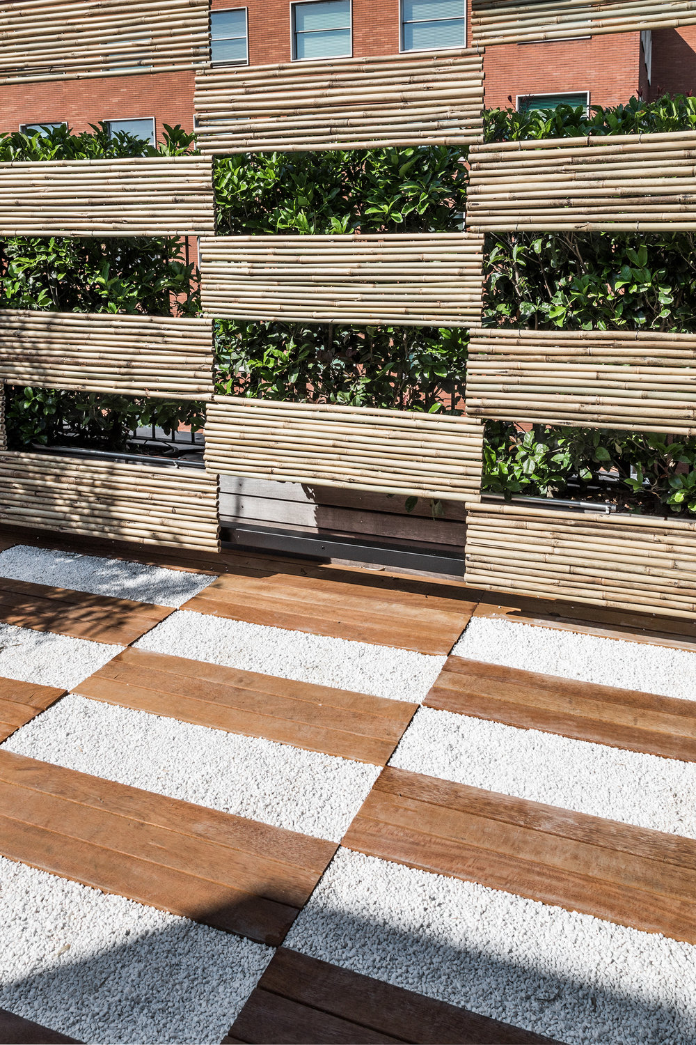 In this installation Lavit looks to strictly define the spatial coordinates but in reality he knows that natural elements linked to the outdoors – the sun, clouds and shadows – would have broken the canons to continually revitalize the space and make it more complex as the day unfolds. The roof covering contrasts the vegetal with the mineral, filtering the view of the surrounding city and changing the perspectives in a playful way while maintaining a scale with a human dimension. Lavit’s modulor is in fact 100x33, almost like a real version of a viewfinder of a CinemaScope camera.