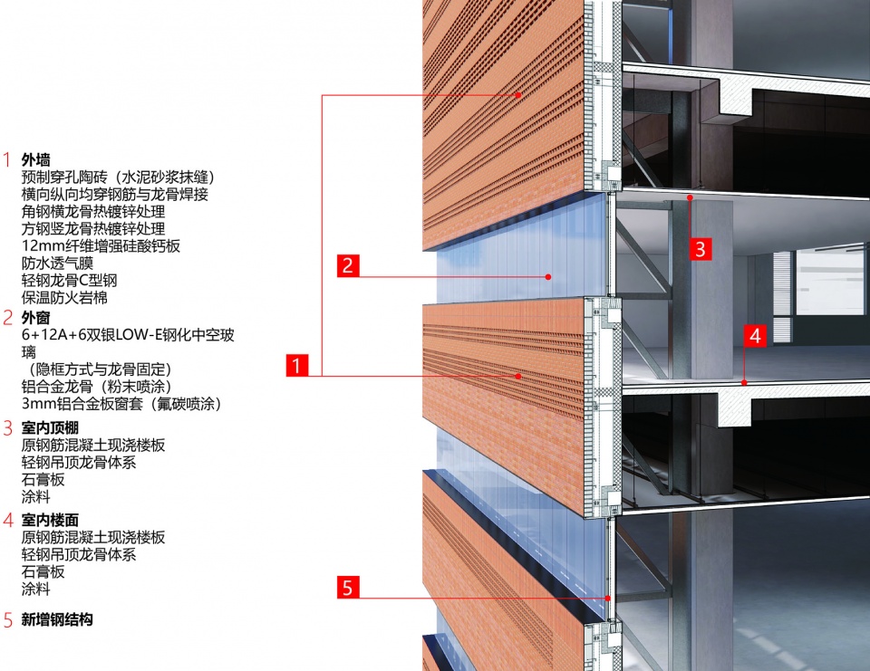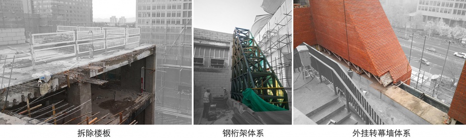 Of course, meeting the technical challenges of the old reform itself has also brought countless sense of achievement in design and construction. In order to form an inverted conical hollow atrium on the North facade, we removed an original structural column on the north side, removed local floors and beams on the second, third and fourth floors layer by layer, and strengthened the lintel on the top of the fourth floor. However, the overhang of the third floor slab was too large, which once made the scheme unsolvable. Finally, we came up with a new suspension column from the upper layer to solve this problem. For another example, there are two large brick curtain walls extending out of the main scope of the building at the sunken garden of the roof, which are in danger of overturning or twisting, and there is also the possibility of deformation. However, we don't want to have deep pull connection at the back. Finally, after several modifications, we use the steel truss system with strong stiffness to solve it. These challenges have made the programme exhausted.