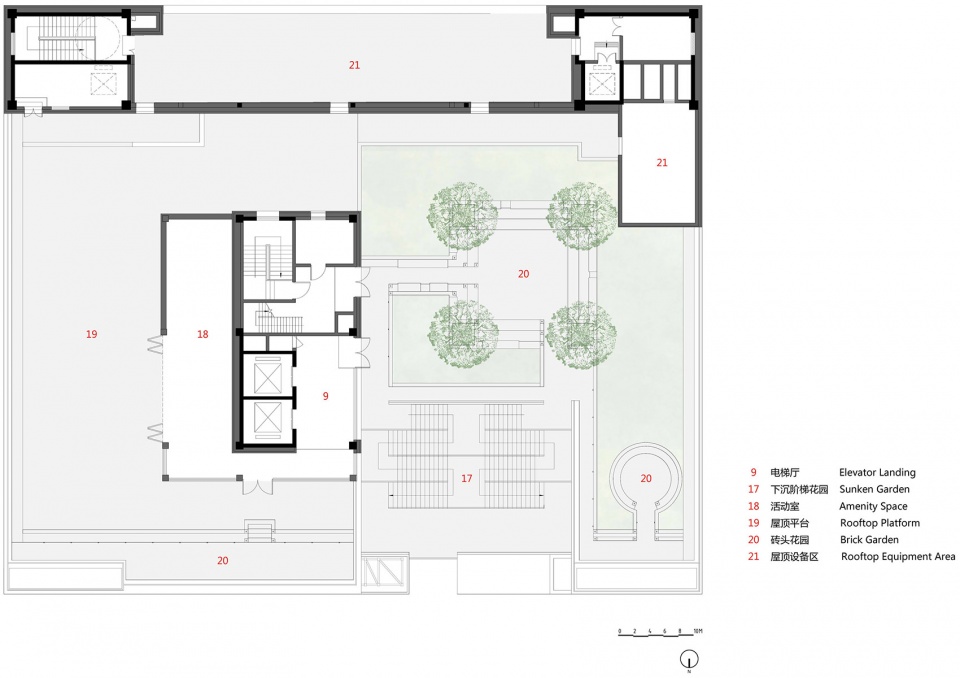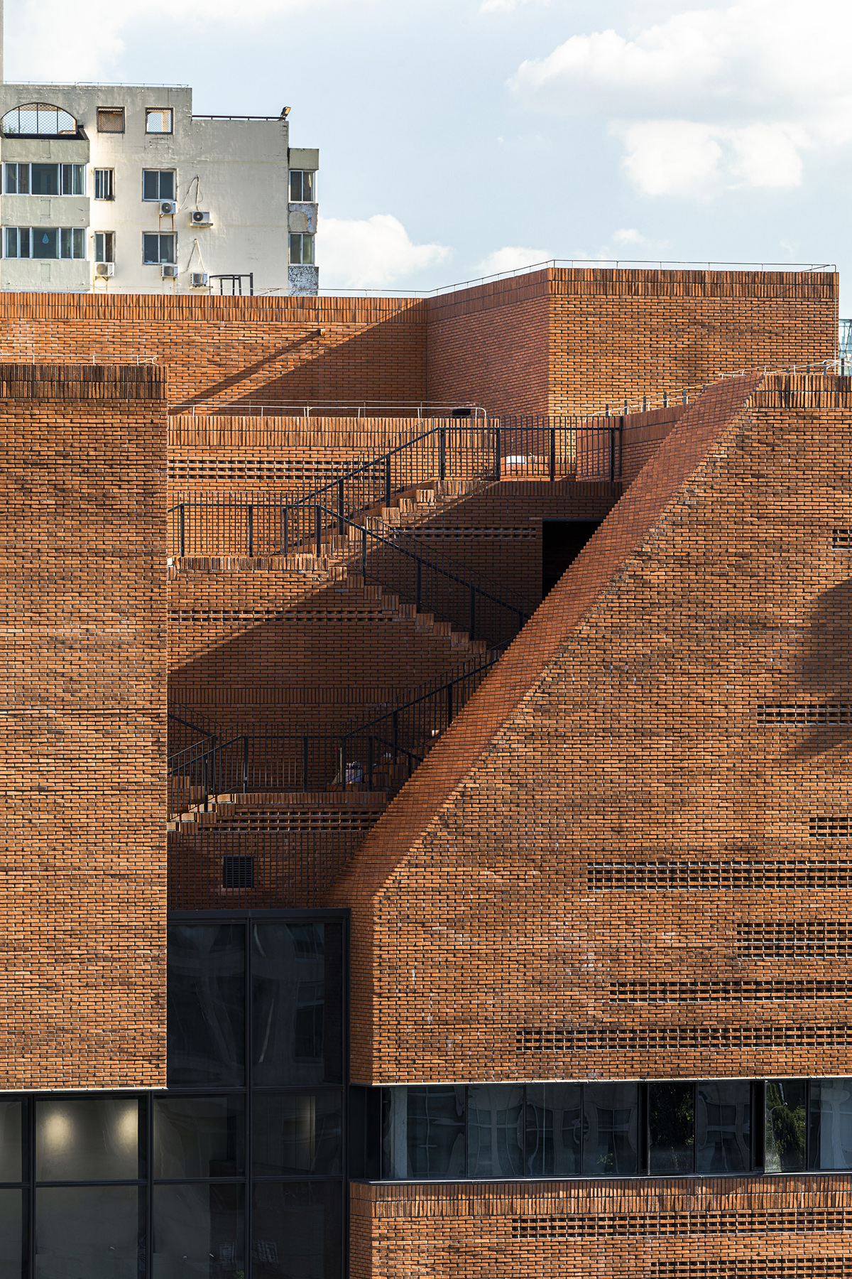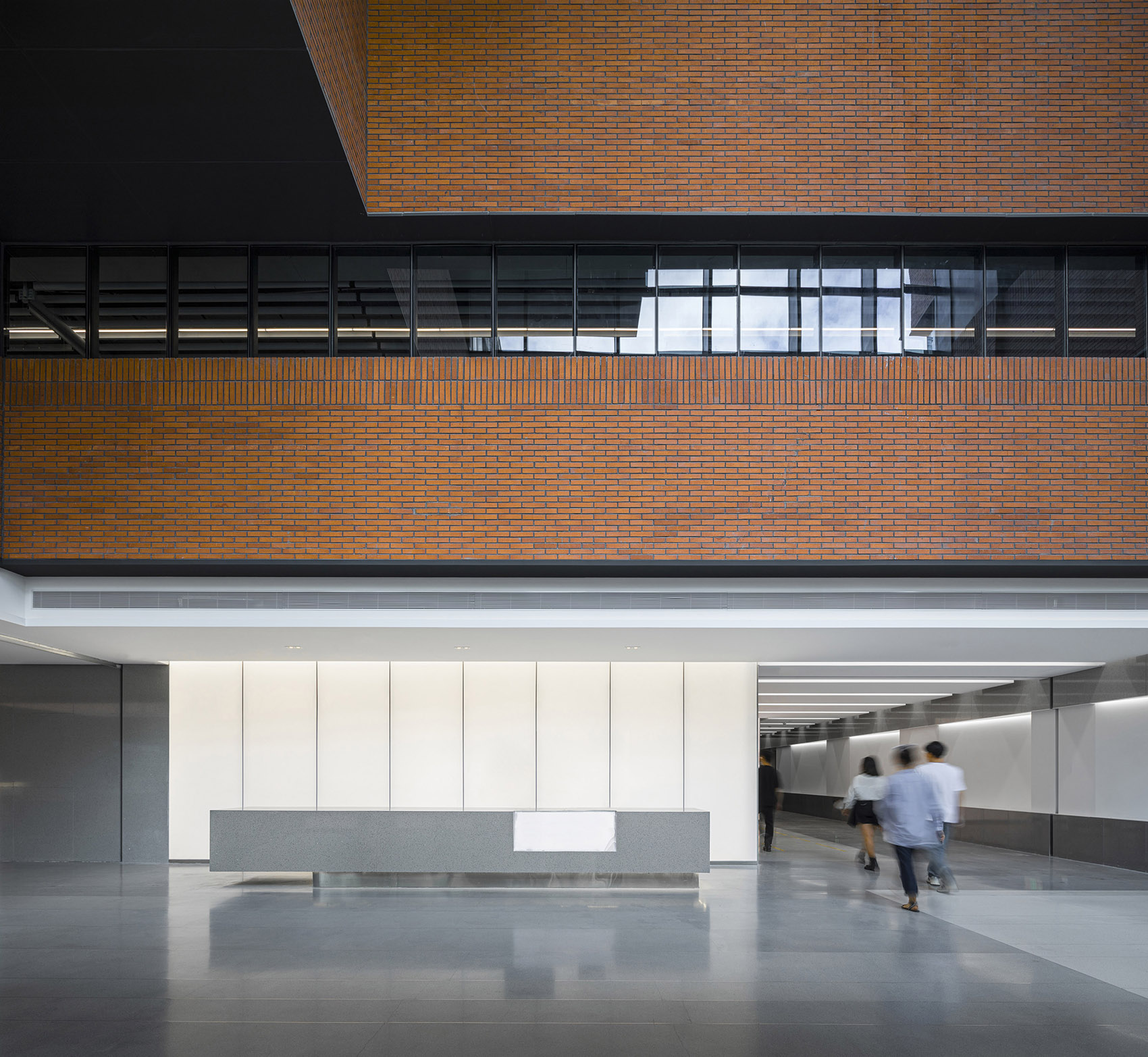 The final plan is a simple response to the above thinking: the building facade adopts the brick curtain wall system with the characteristics of Tsinghua "red area", and uses strong lines to express the connection between the upper and lower space on the facade: a shallow four storey high is dug out in the entrance hall to form a space for climbing up the inverted ladder; The roof garden sinks two floors on the facade to form a space to embrace from top to bottom, and tear open an inverted triangular gap on the facade. This composition breaks through the pattern of facade transformation and activates the internal space through internal and external coherence.