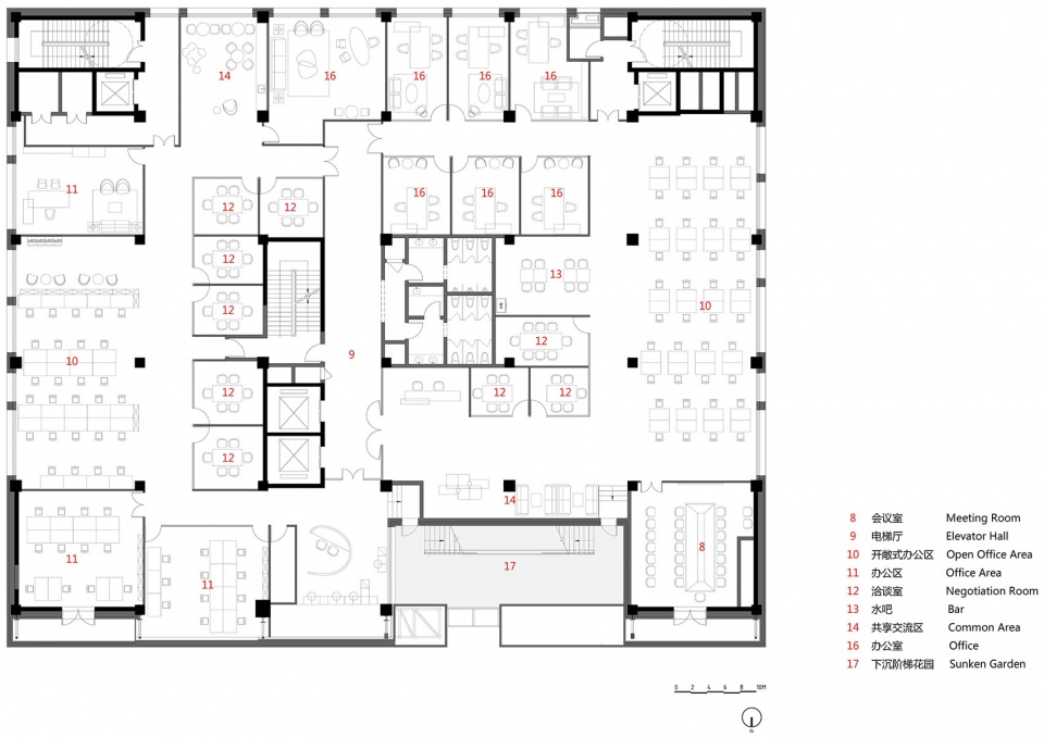 因此,结构工程师经过大量的比较方案,最终选择了对若干结构柱进行了加固的平衡刚度方法。当然,更大的挑战是锯掉柱子。使用方提出要做一个国际会议厅,但必须放在一层方便外来人员进出的位置,这意味着要有结构切割大手术,需要在首层用梁抬柱方式打造一个两层通高空间。