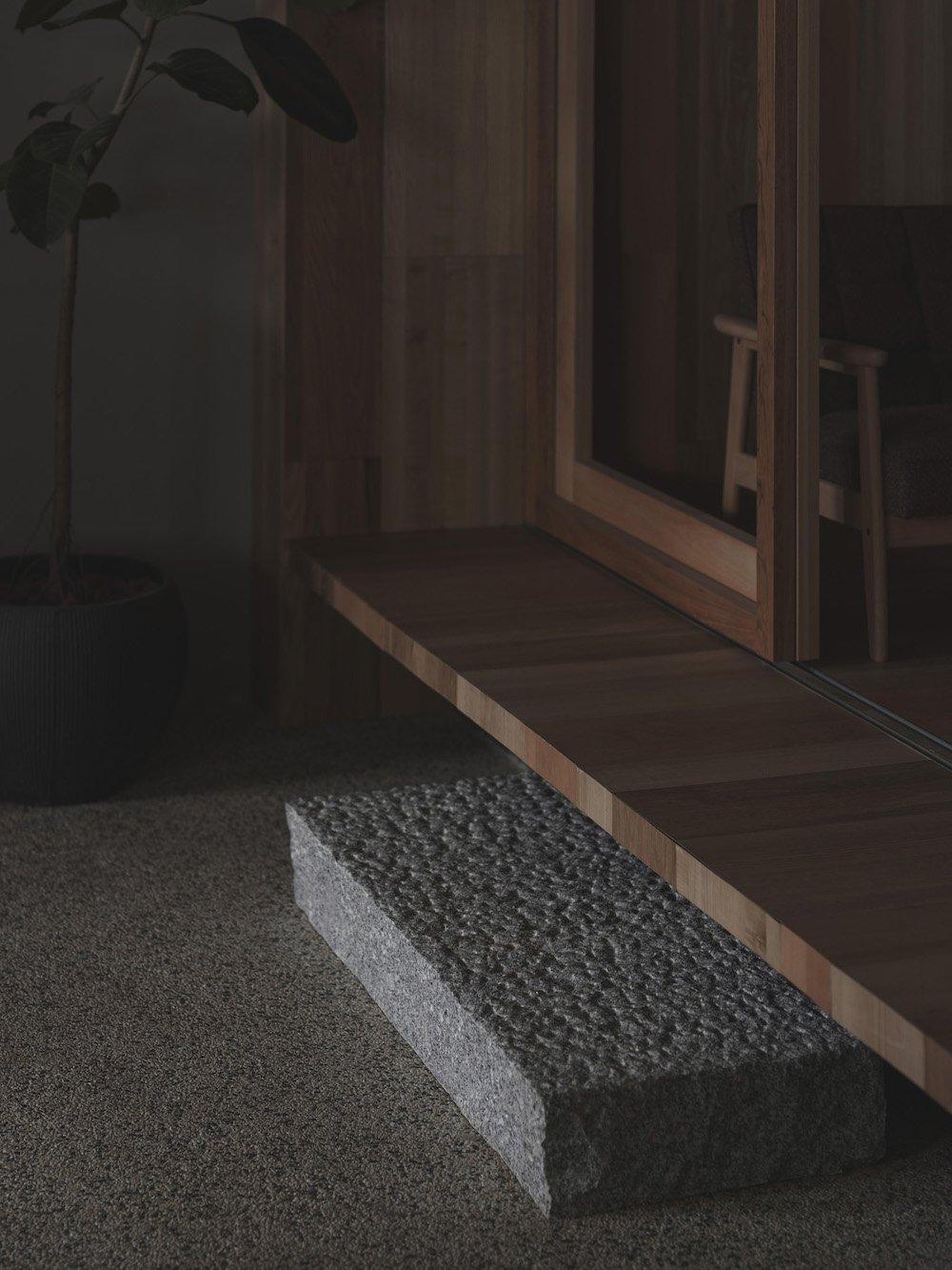 When customers pass through the display space, the cabin with a pitched roof can be seen. The cabin is to accommodate store events and temporary exhibition projects. Inspired by the tea fields in Hangzhou, we intend to create a sense of harmonious symbiosis between human and nature. The two stone steps connect the cabin and the display space, presenting a cozy and relaxed scene: people gather inside the cabin while others take a rest under the eaves in nature. The facade of the cabin provides a sense of openness since the wood-frame sliding doors visually separate the cabin lightly from the display space. Flooring, walls and ceiling of the cabin feature five different kinds of wood (beech, walnut, white oak, cherry and ash); all are of the materials which the brand use in their furniture making. The blend of different wood types extends to the detailed design of the wood sliding doors and the entrance of the store. Through the practice of solid wood materials, we attempt to form a dialogue with the brand’s furniture collection. The natural texture of the wood imparts a sense of warmth and tenderness for the space.