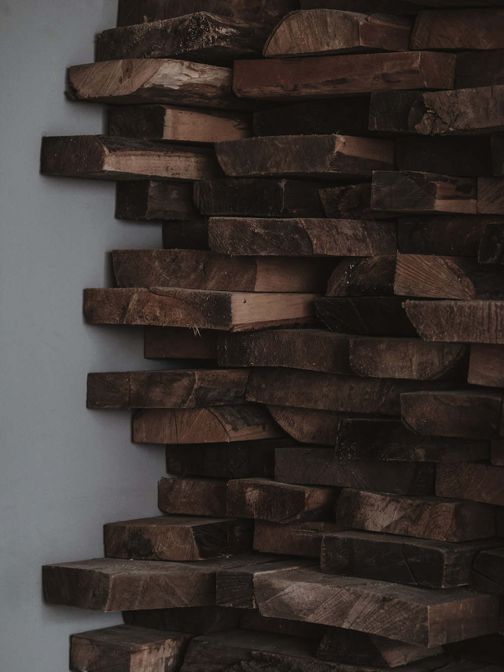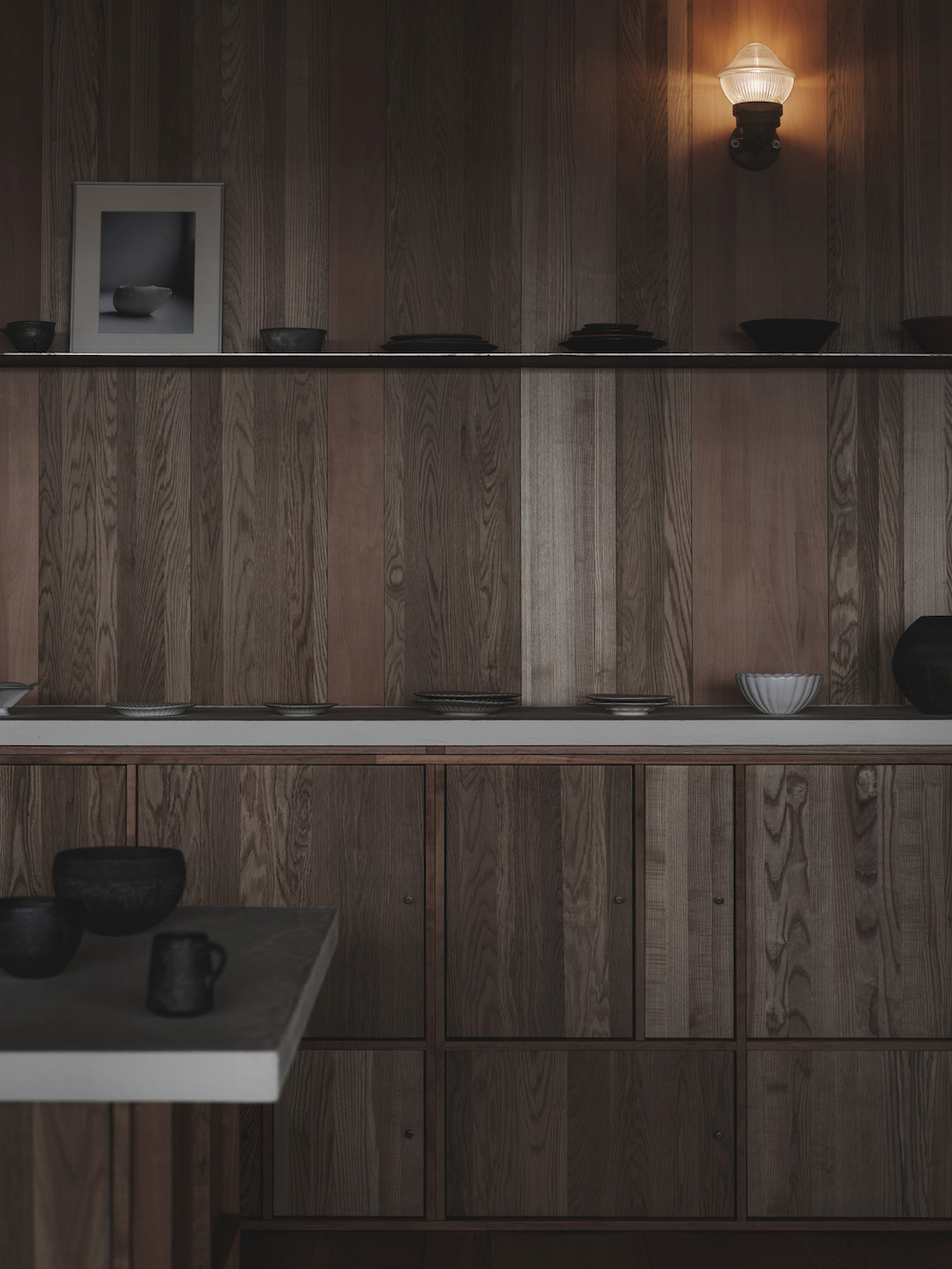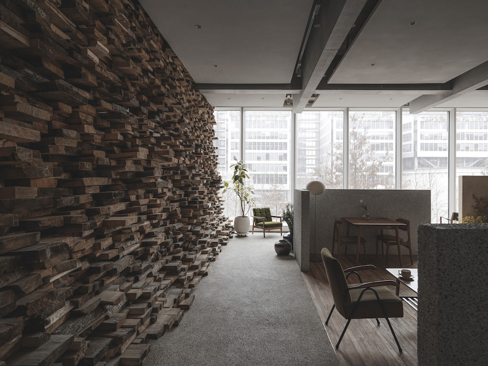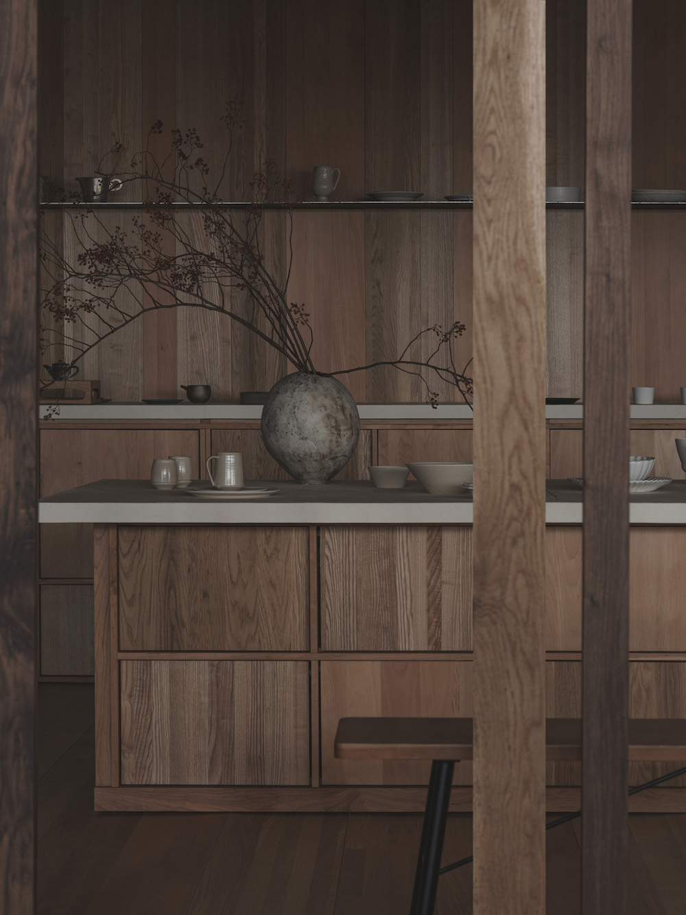 商店的另一个特点是展示空间一侧的木墙。整面墙由堆叠的天然木材覆盖,是商店的视觉焦点,同时作为小物件的展示区。在材料方面,我们选择的木材是家具厂生产留下的老杨木。在我们回收之前,剩余的老杨树在仓库中存放了多年。陈年木材独特的质感,折射出一丝岁月的痕迹和熟悉感。由于每一块木头的独特性,我们用它们在我们的工作室进行了小规模的实验,以测试它的视觉效果,然后我们最终在 OōEli 的建筑工地与工人一起堆叠和建造木头。即兴和实验性的墙壁制作过程是一种依靠时间、木材和手工艺相互作用的方法。由于设计和制作过程,木材被赋予了情感,为其最终呈现带来了独特的力量。木材的体积将自然气味带入空间,气味会随着时间而变化。我们相信,在电子商务平台蓬勃发展的时代,独特的感官体验有能力将人们带回实体零售空间。