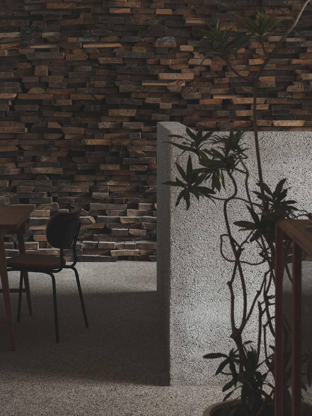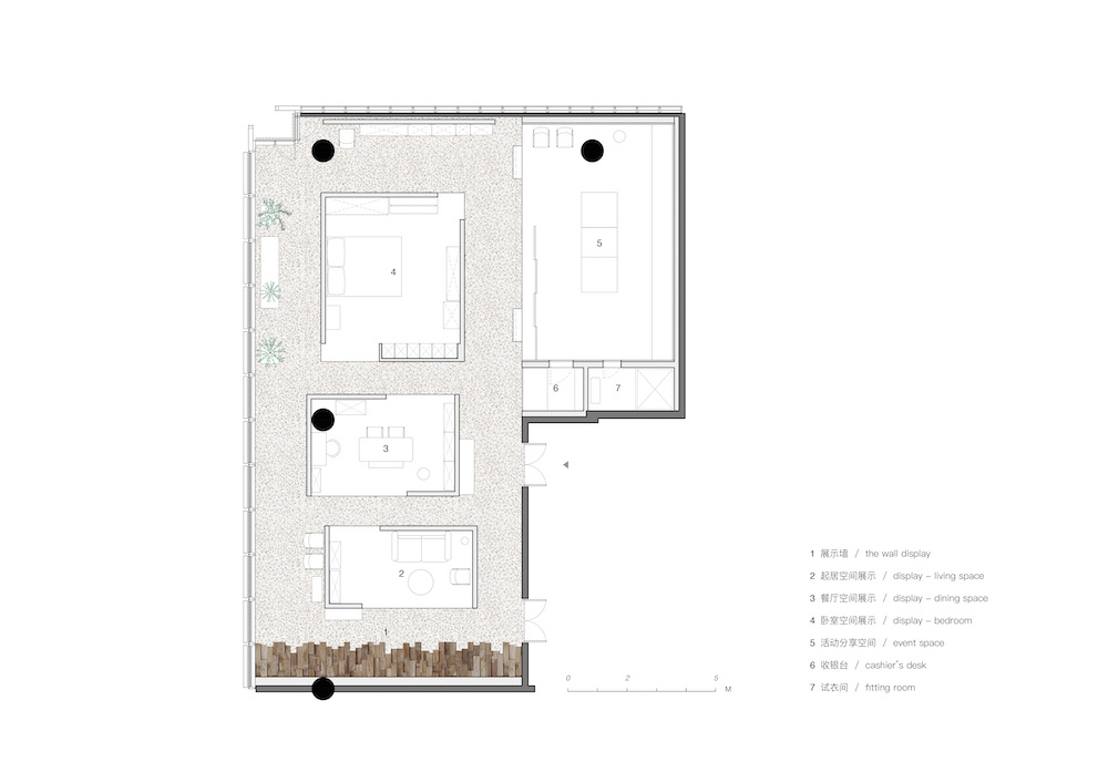 The whole retail space is mainly divided into furniture display area and an event space. The three scattered washed stone boxes together form the display space: each box area exhibits a living scene with carefully selected furniture collection. We intend to enrich the spatial experience in the long display space by inserting semi-enclosed box spaces with different wall heights and therefore making people to explore and wander in and between the boxes. The natural and rough texture of the washed stone walls provides a soft and warm atmosphere.