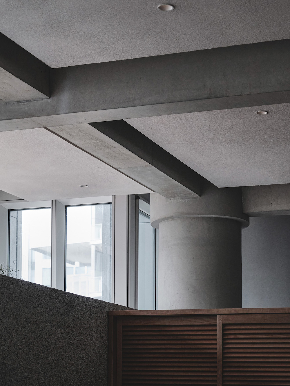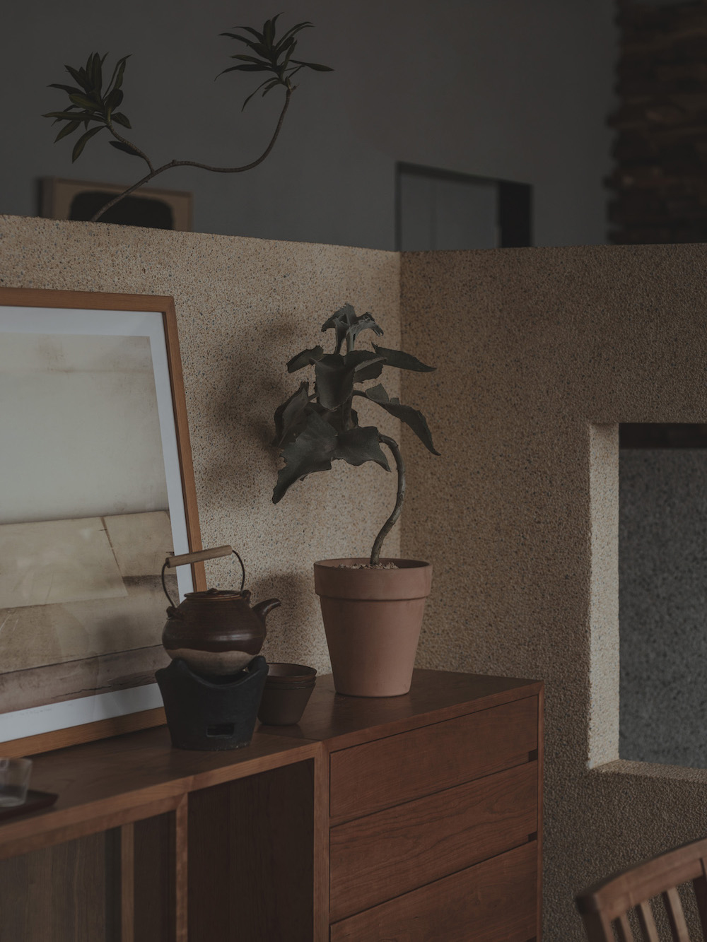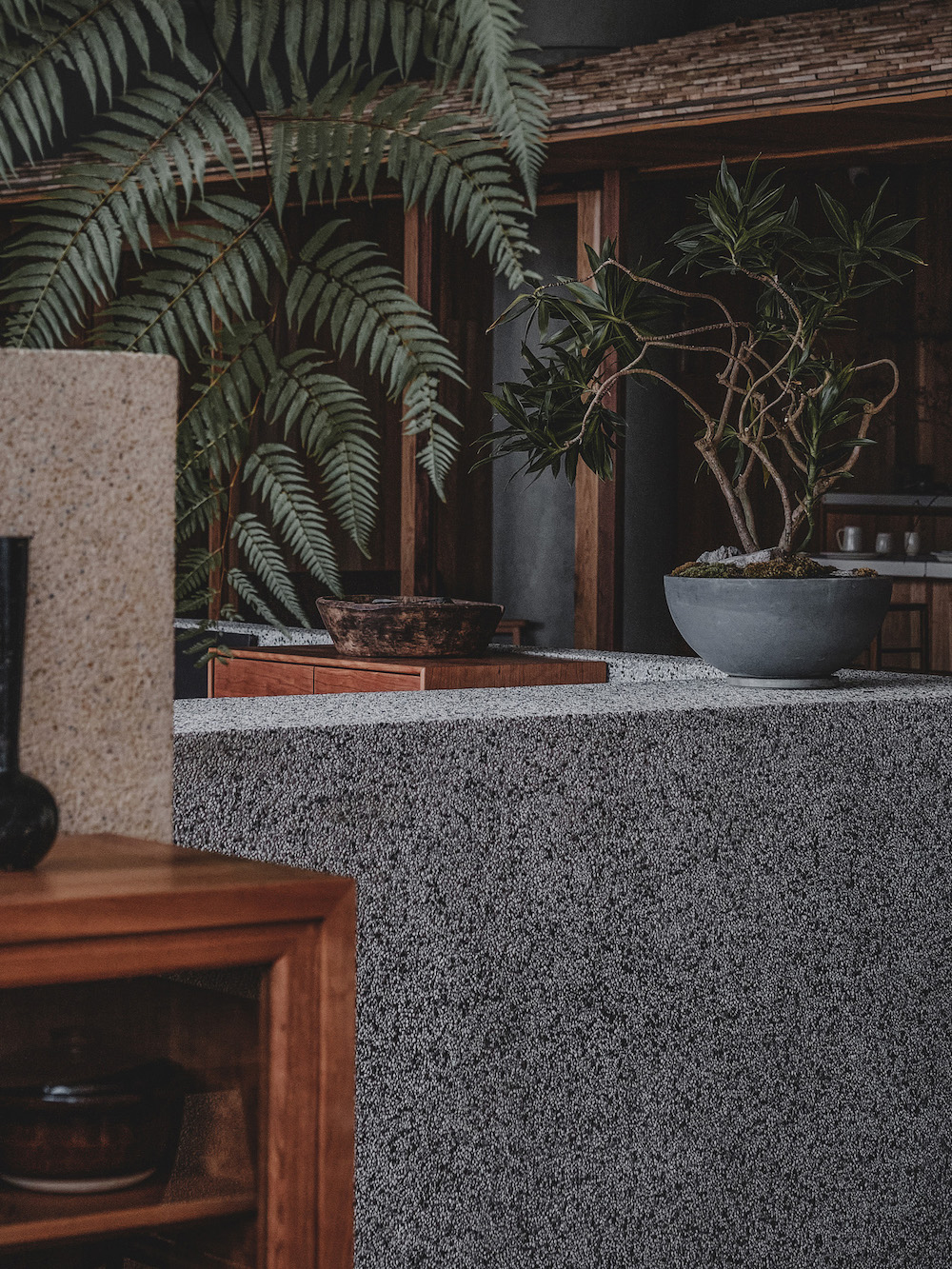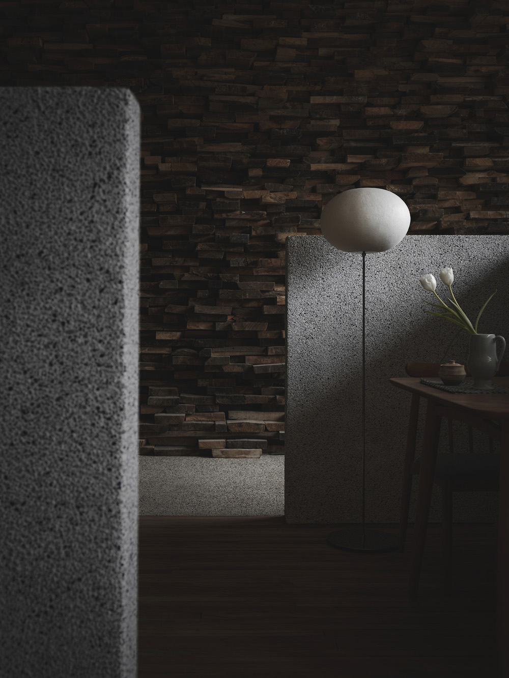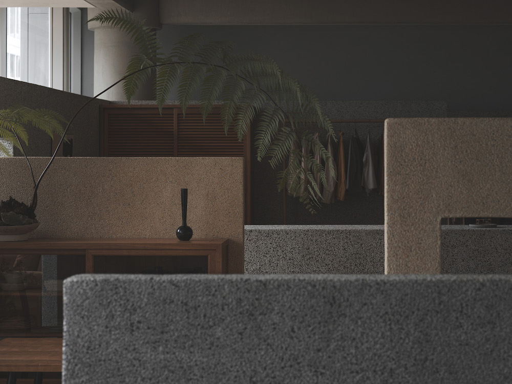 整个零售空间主要分为家具展示区和活动空间。三个散落的水洗石盒子共同构成展示空间:每个盒子区域都展示了一个生活场景,精心挑选的家具收藏。我们打算通过插入不同墙高的半封闭盒子空间来丰富长展示空间的空间体验,从而使人们在盒子中和盒子之间探索和游荡。水洗石墙自然粗犷的质感营造出柔和温馨的氛围。